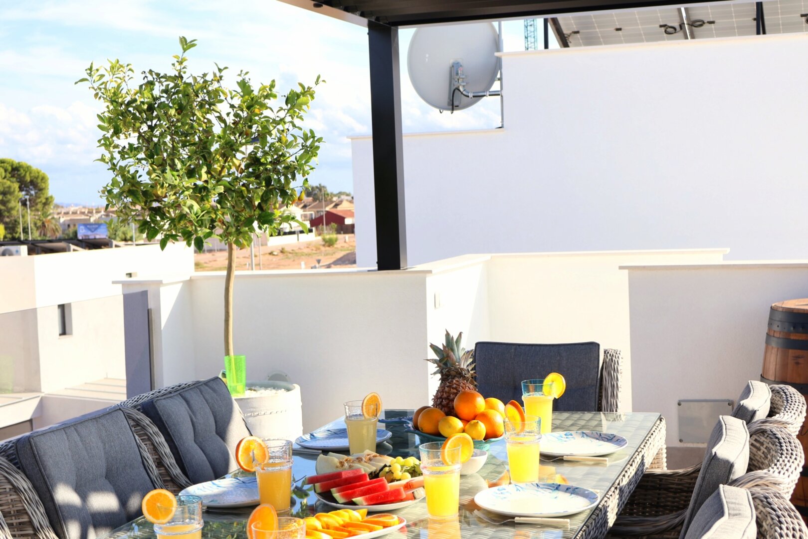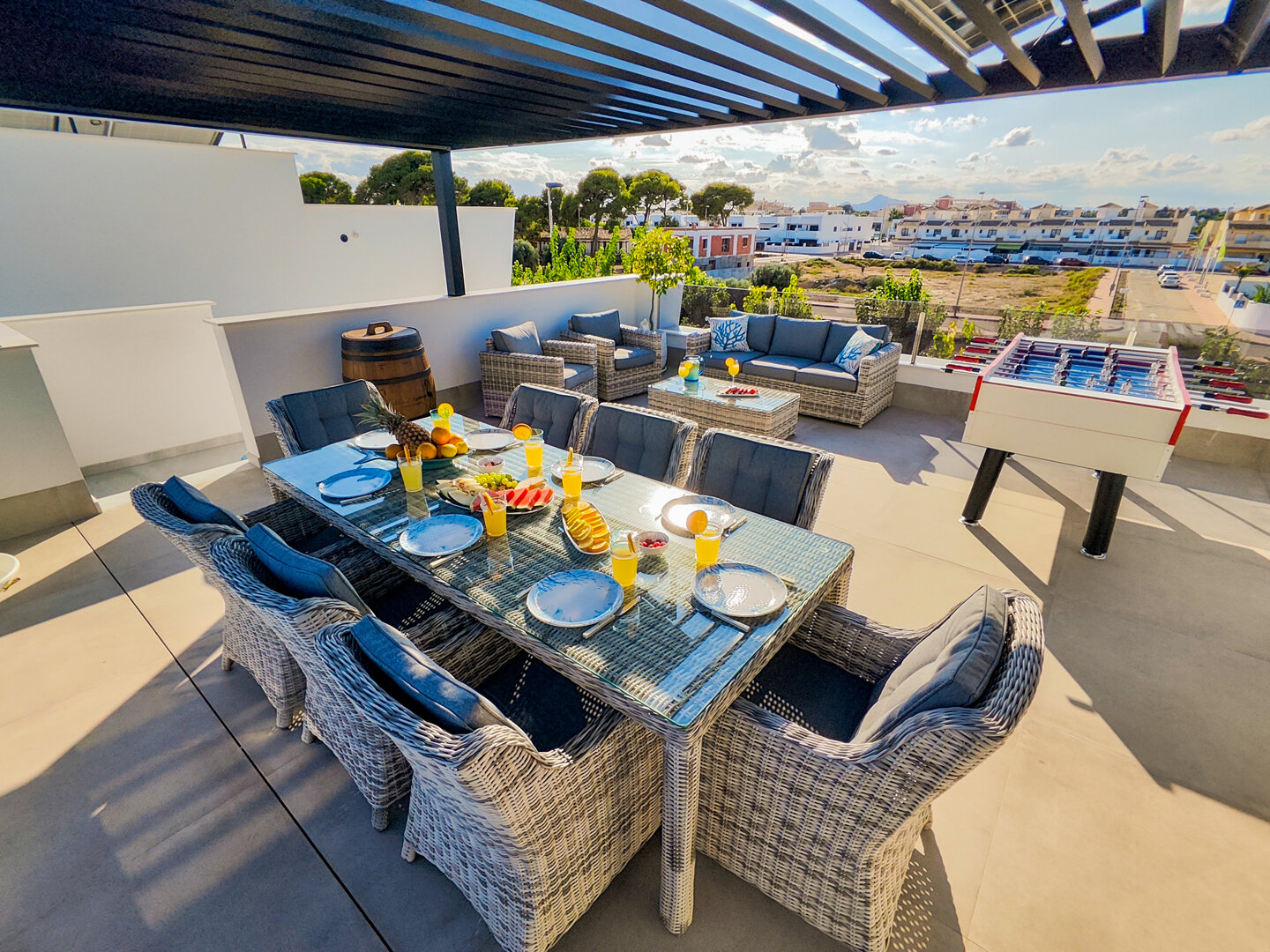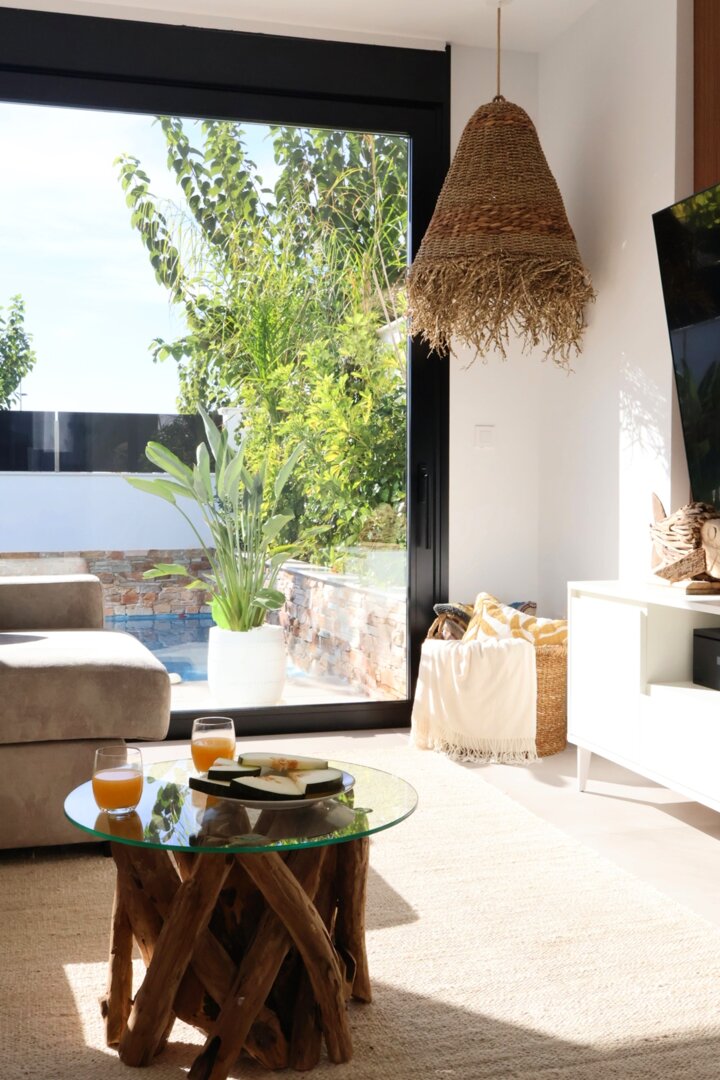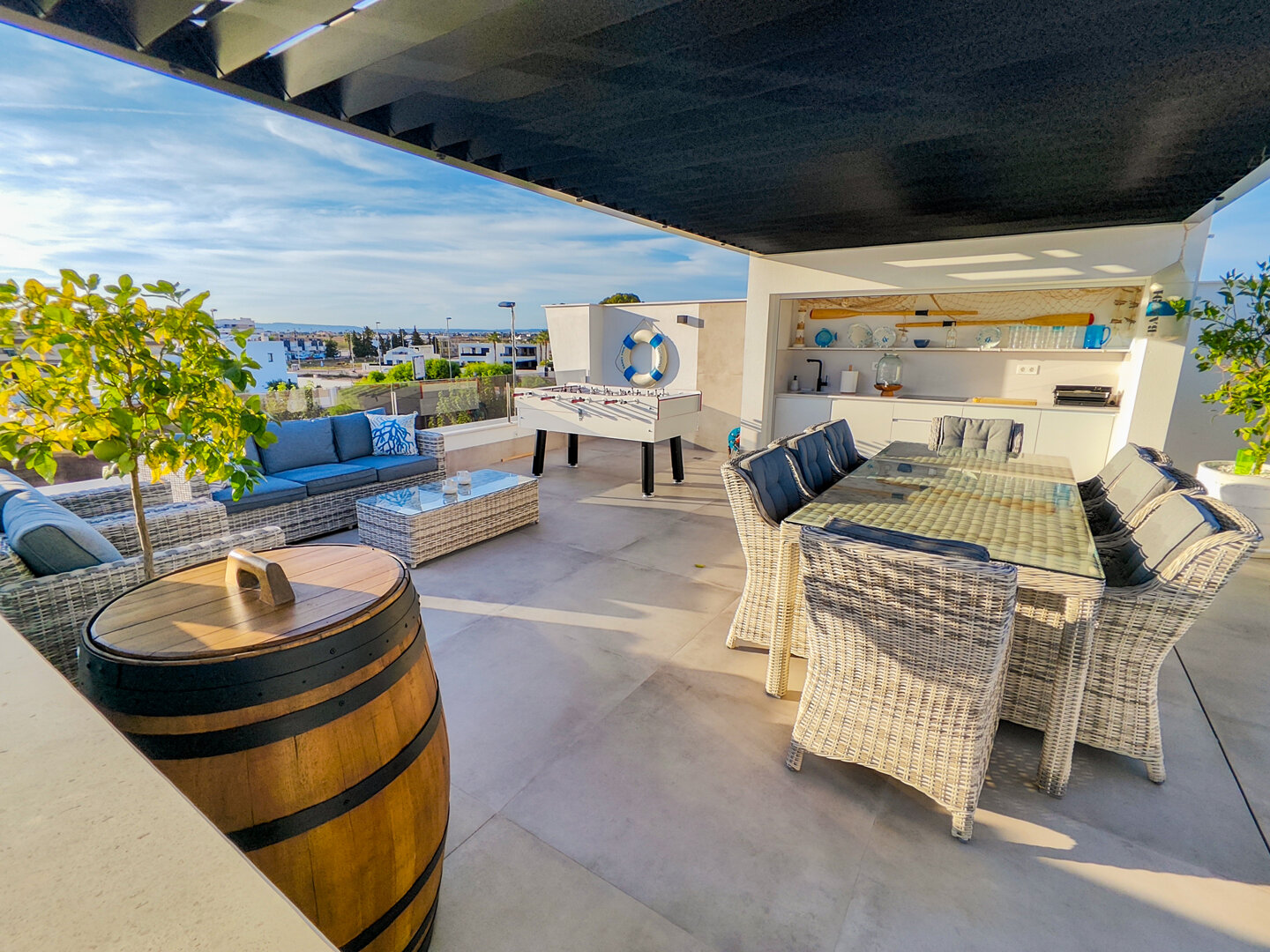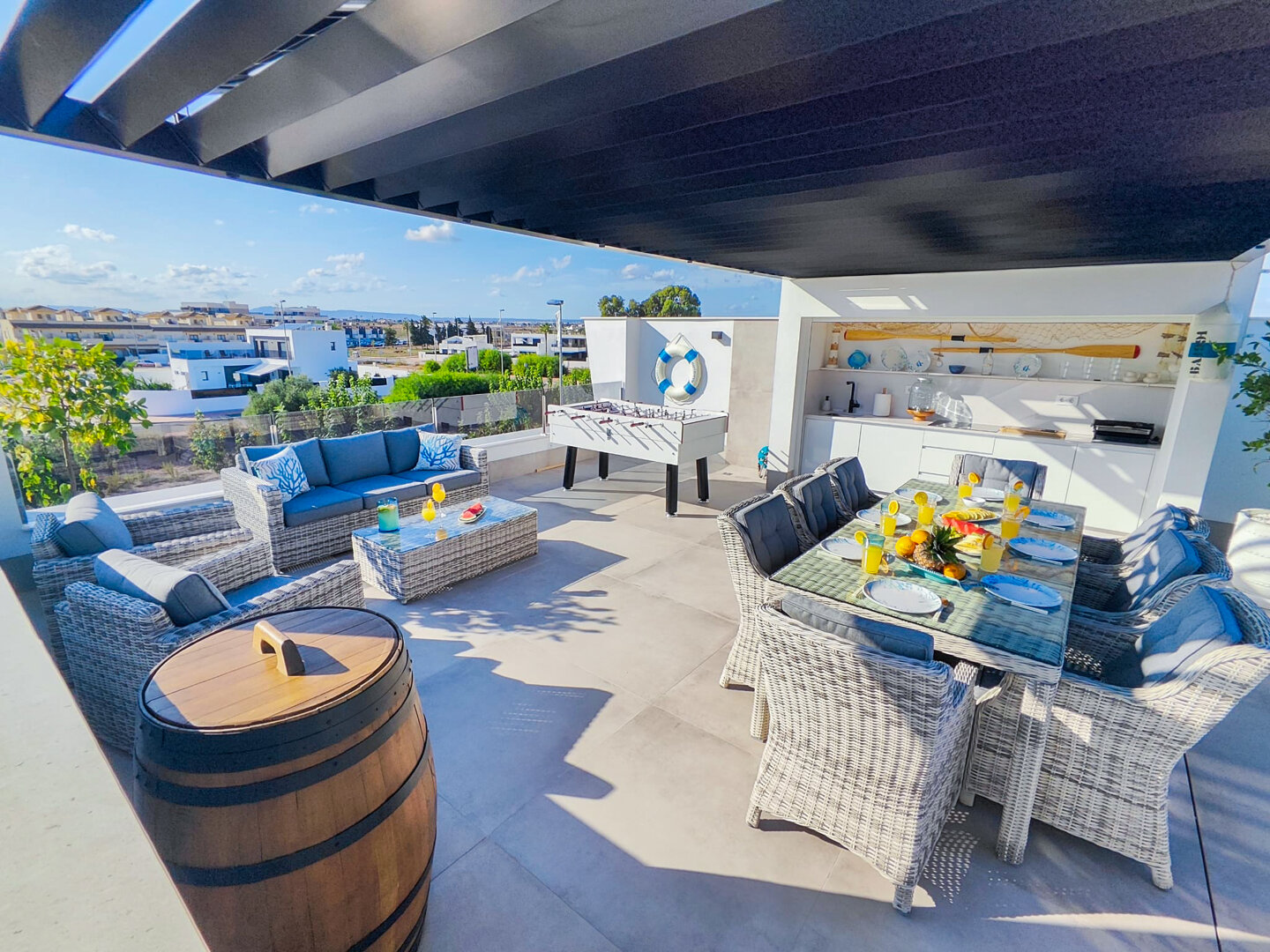 Villa description: Villa Murcia offers 220 m² of fully private space — the entire house, garden and terraces are reserved exclusively for you and your group. The interiors are bright, elegant and designed to provide full comfort for both short stays and longer holidays. Three bedrooms with private terrace access, air conditioning and TVs allow for independent relaxation, and the spacious living room with PlayStation is perfect for evenings together. The kitchen equipped with SMEG appliances makes home cooking easy and enjoyable, while the rooftop summer kitchen — with a grill, induction hob and fridge — creates the perfect setting for open-air dinners. The villa offers three bathrooms with underfloor heating and a full set of towels, including pool towels. A citrus garden allows you to pick your own lemon in the morning.