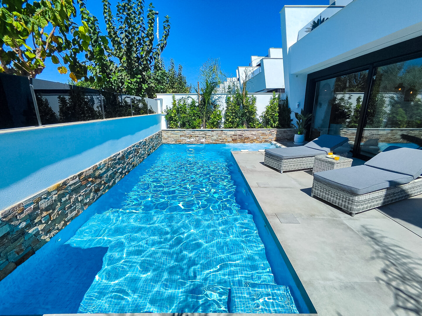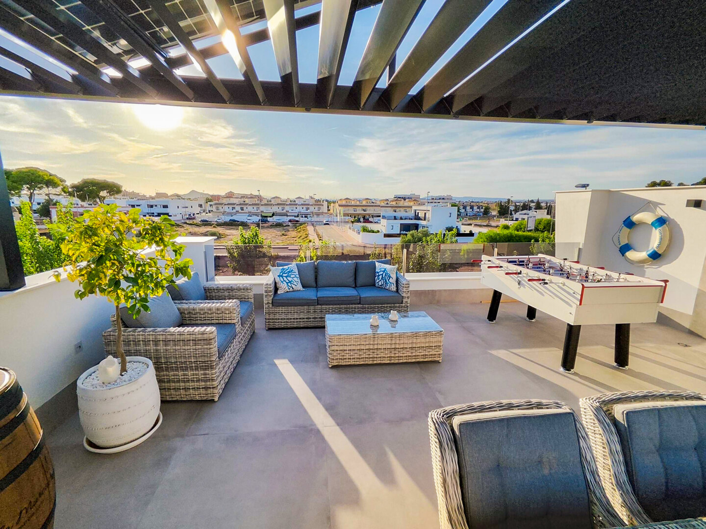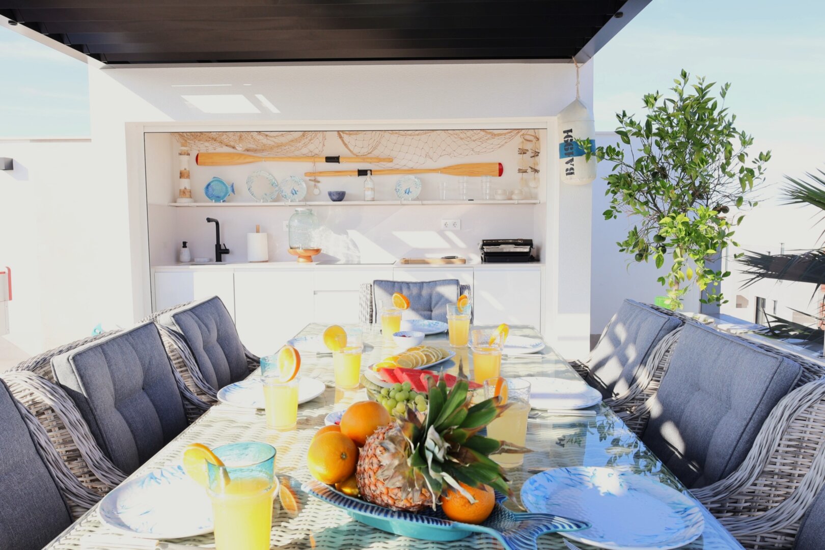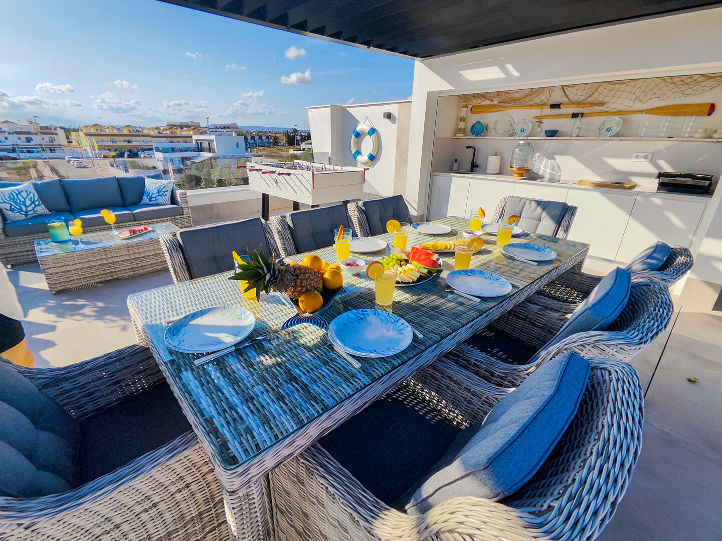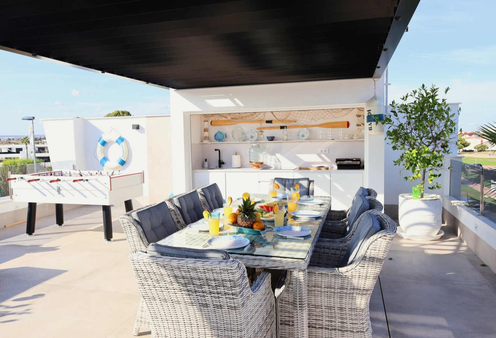 Villa description: Villa Murcia offers 220 m² of fully private space — the entire house, garden and terraces are reserved exclusively for you and your group. The interiors are bright, elegant and designed to provide full comfort for both short stays and longer holidays. Three bedrooms with private terrace access, air conditioning and TVs allow for independent relaxation, and the spacious living room with PlayStation is perfect for evenings together. The kitchen equipped with SMEG appliances makes home cooking easy and enjoyable, while the rooftop summer kitchen — with a grill, induction hob and fridge — creates the perfect setting for open-air dinners. The villa offers three bathrooms with underfloor heating and a full set of towels, including pool towels. A citrus garden allows you to pick your own lemon in the morning.