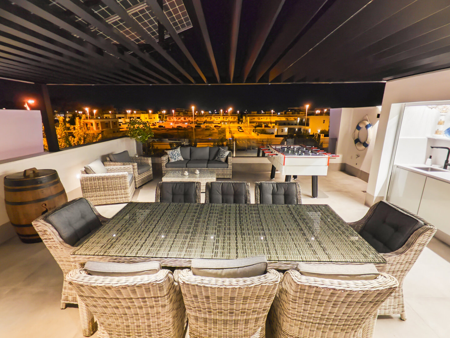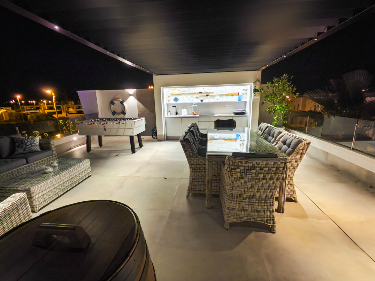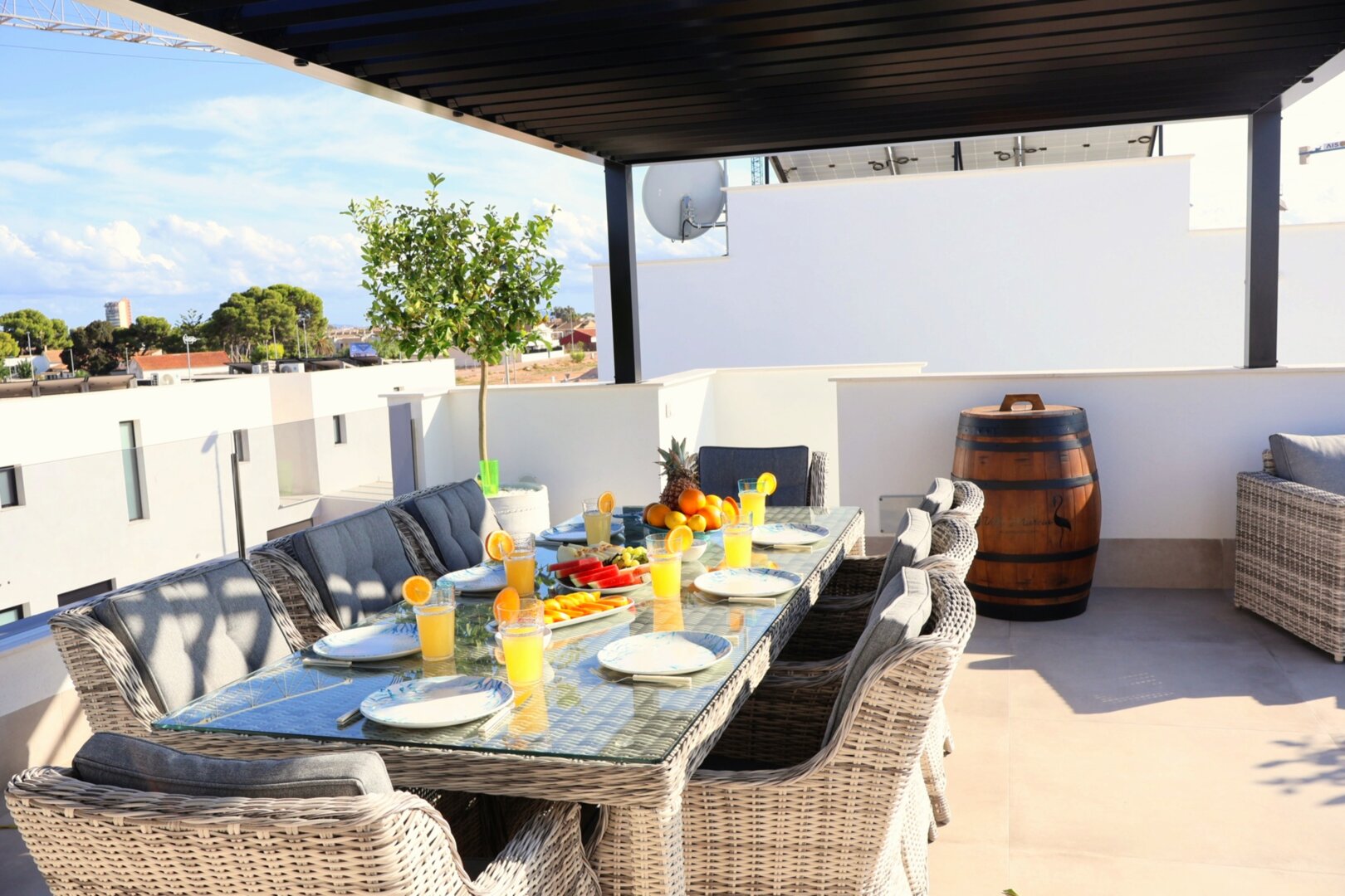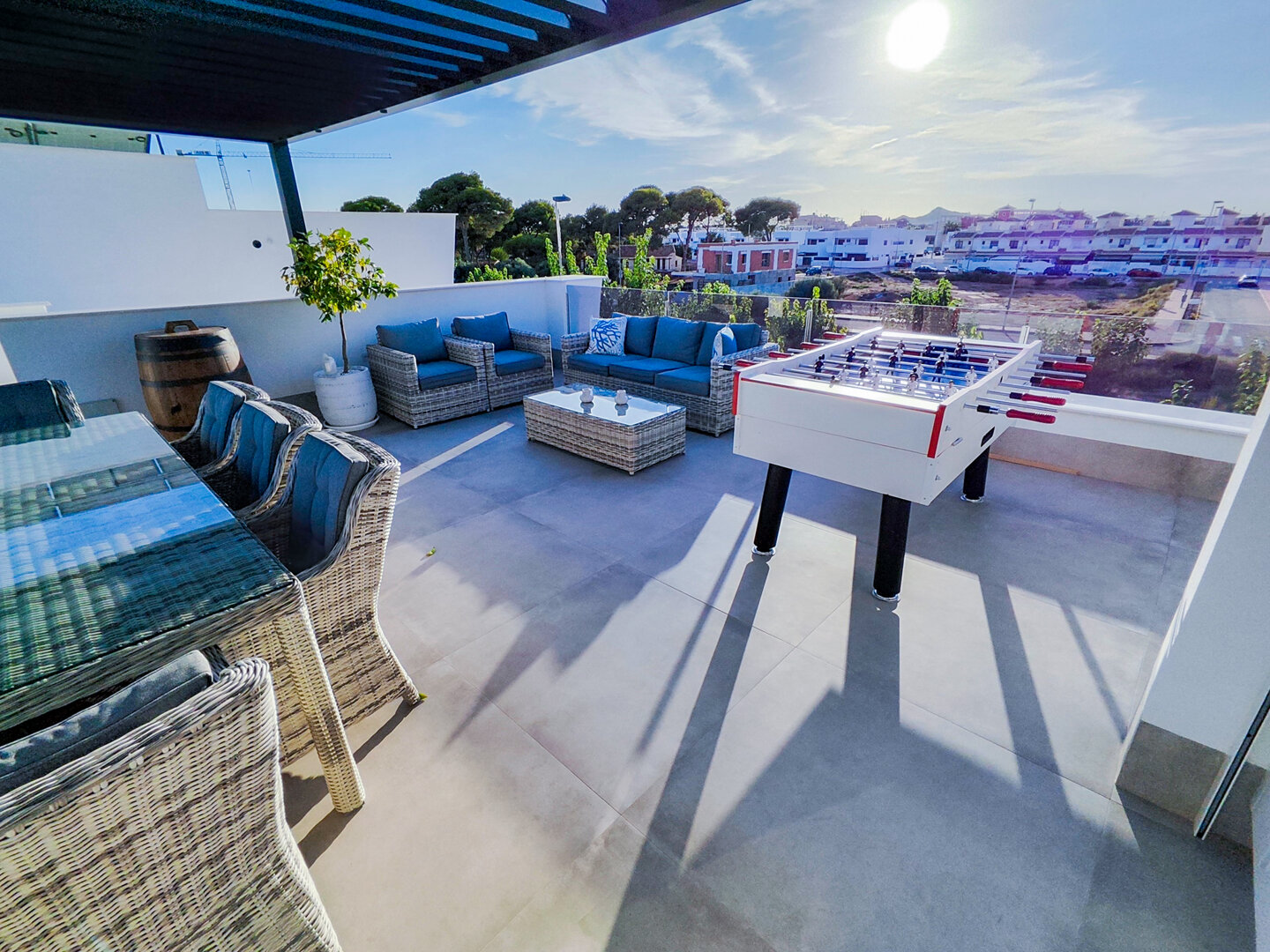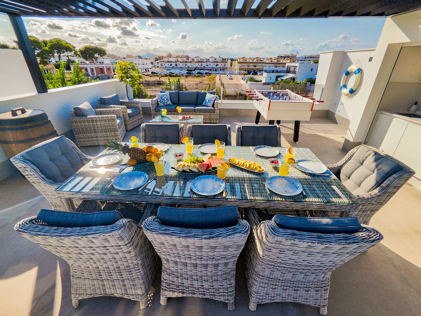 Villa description: Villa Murcia offers 220 m² of fully private space — the entire house, garden and terraces are reserved exclusively for you and your group. The interiors are bright, elegant and designed to provide full comfort for both short stays and longer holidays. Three bedrooms with private terrace access, air conditioning and TVs allow for independent relaxation, and the spacious living room with PlayStation is perfect for evenings together. The kitchen equipped with SMEG appliances makes home cooking easy and enjoyable, while the rooftop summer kitchen — with a grill, induction hob and fridge — creates the perfect setting for open-air dinners. The villa offers three bathrooms with underfloor heating and a full set of towels, including pool towels. A citrus garden allows you to pick your own lemon in the morning.