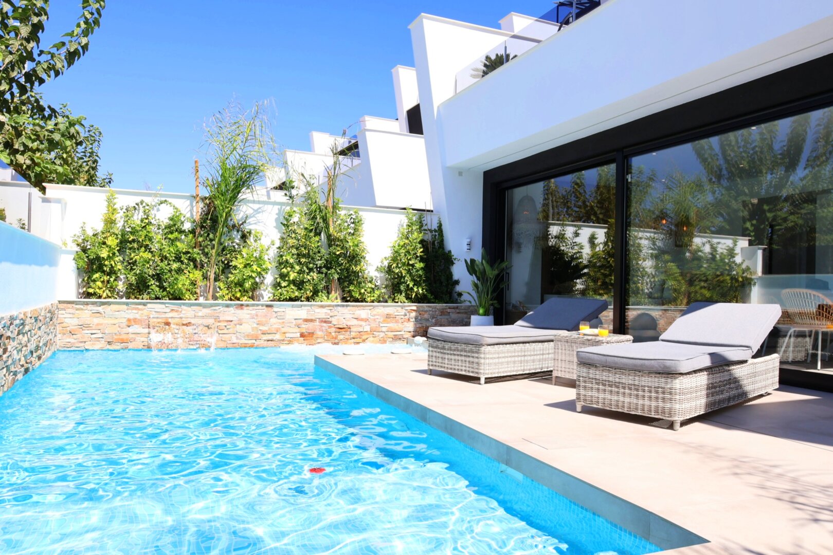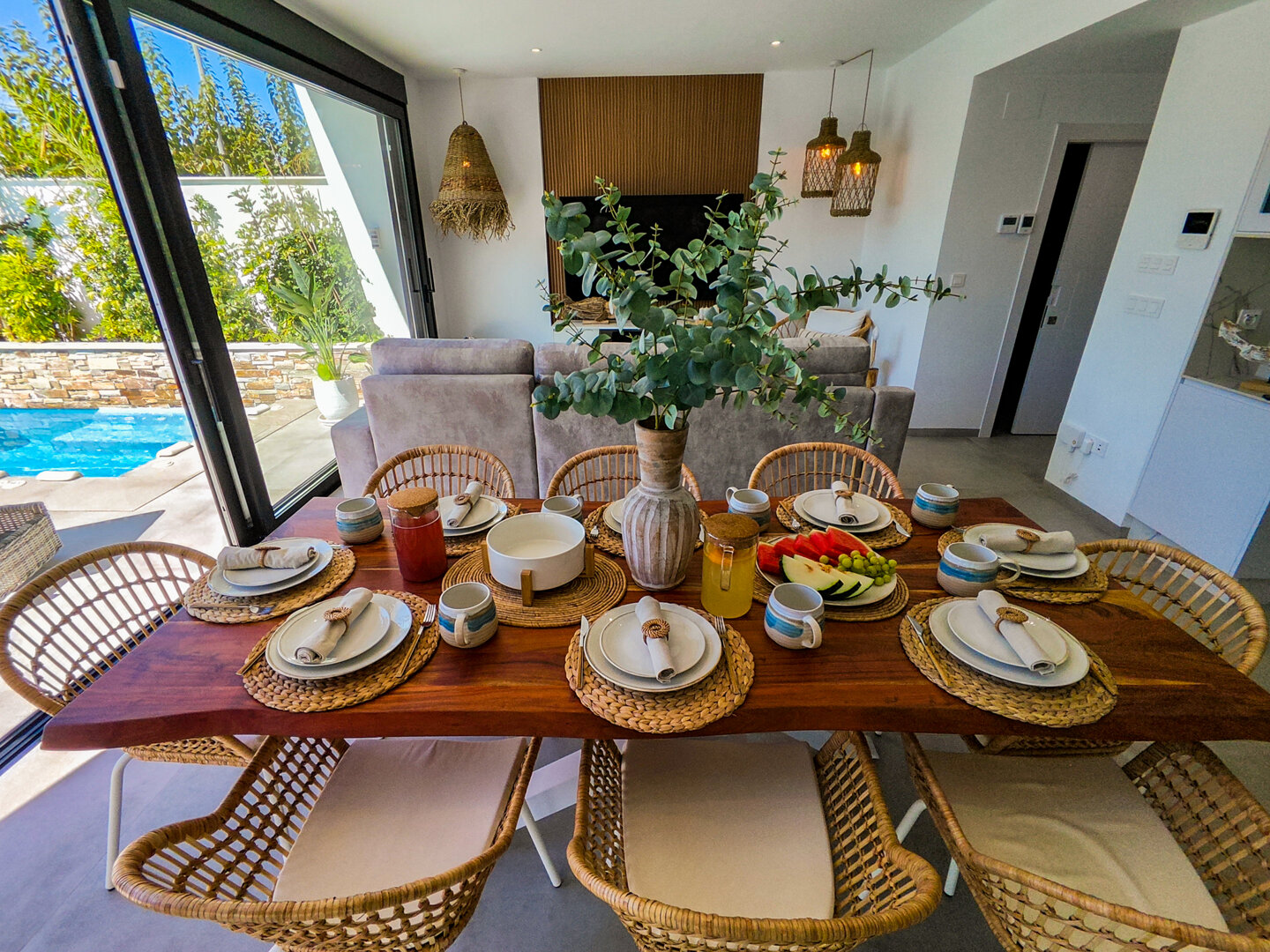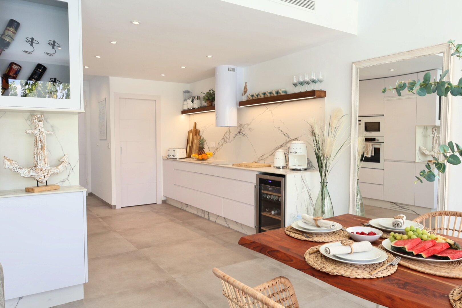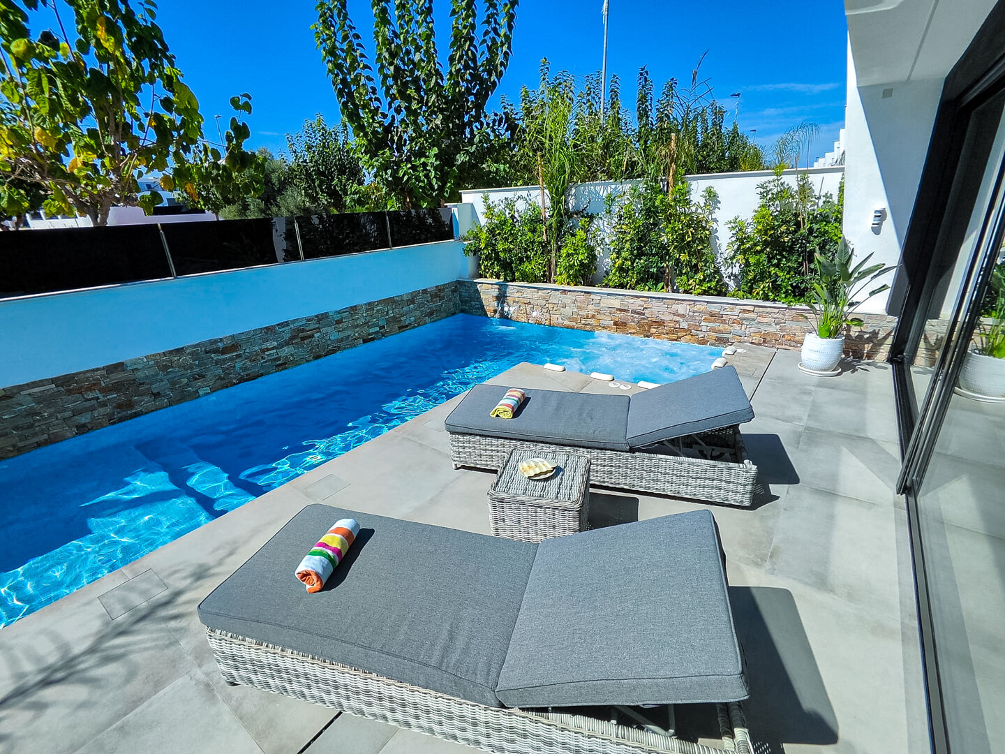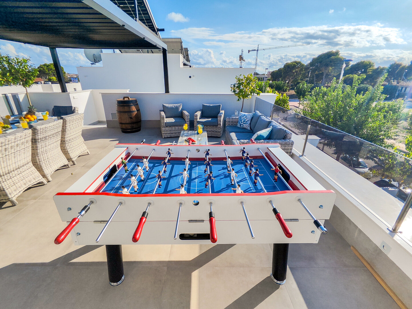 Villa description: Villa Murcia offers 220 m² of fully private space — the entire house, garden and terraces are reserved exclusively for you and your group. The interiors are bright, elegant and designed to provide full comfort for both short stays and longer holidays. Three bedrooms with private terrace access, air conditioning and TVs allow for independent relaxation, and the spacious living room with PlayStation is perfect for evenings together. The kitchen equipped with SMEG appliances makes home cooking easy and enjoyable, while the rooftop summer kitchen — with a grill, induction hob and fridge — creates the perfect setting for open-air dinners. The villa offers three bathrooms with underfloor heating and a full set of towels, including pool towels. A citrus garden allows you to pick your own lemon in the morning.