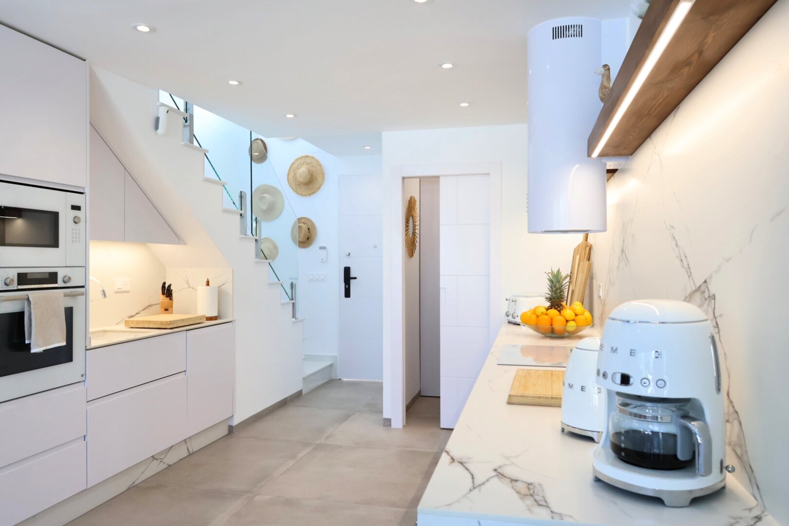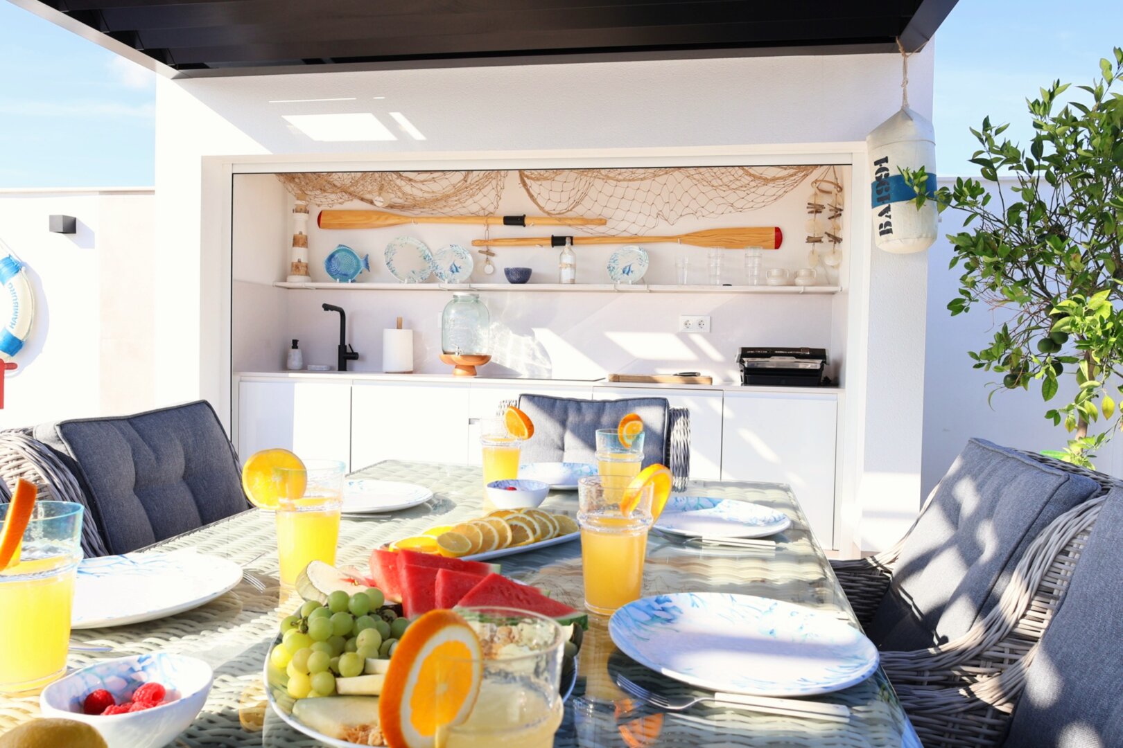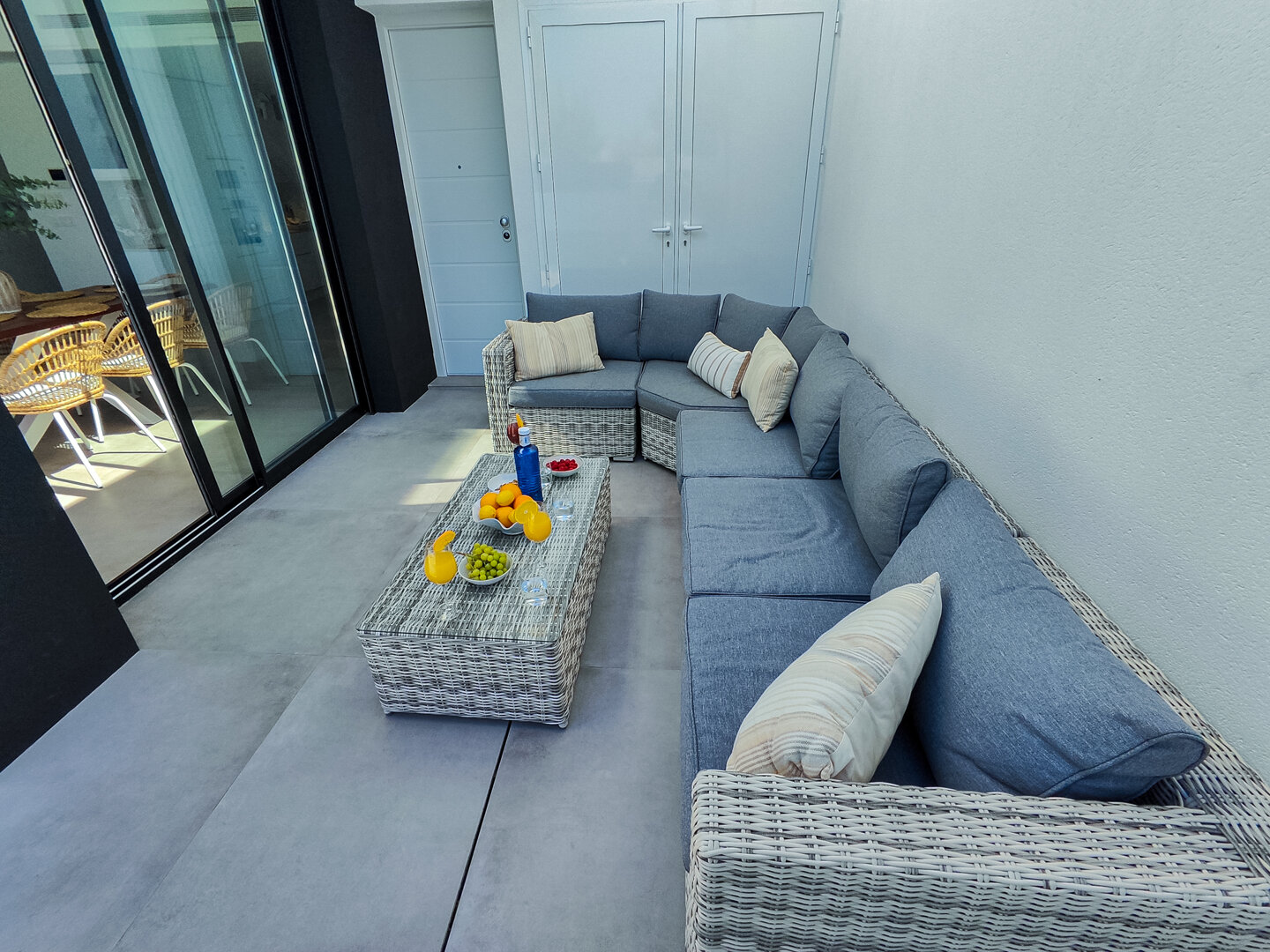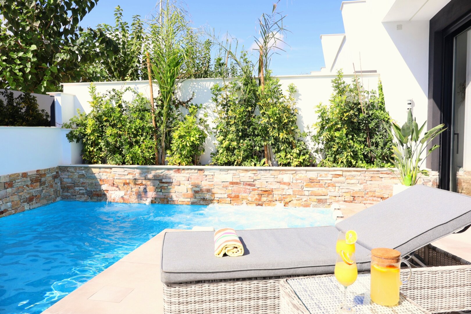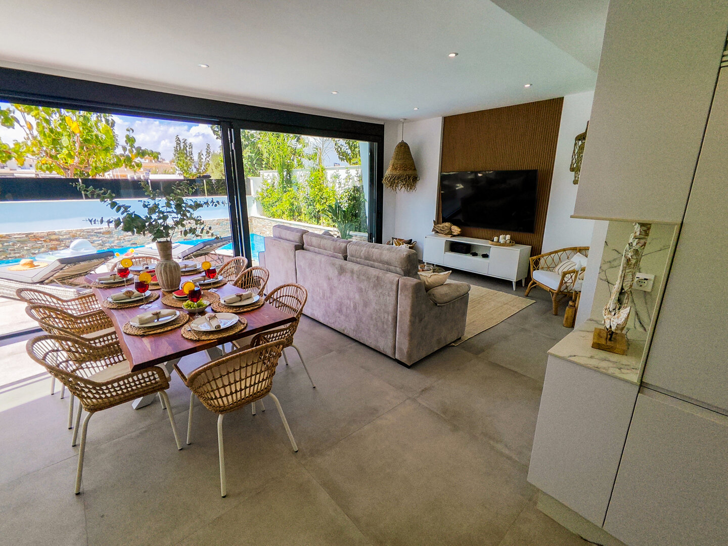 Villa description: Villa Murcia offers 220 m² of fully private space — the entire house, garden and terraces are reserved exclusively for you and your group. The interiors are bright, elegant and designed to provide full comfort for both short stays and longer holidays. Three bedrooms with private terrace access, air conditioning and TVs allow for independent relaxation, and the spacious living room with PlayStation is perfect for evenings together. The kitchen equipped with SMEG appliances makes home cooking easy and enjoyable, while the rooftop summer kitchen — with a grill, induction hob and fridge — creates the perfect setting for open-air dinners. The villa offers three bathrooms with underfloor heating and a full set of towels, including pool towels. A citrus garden allows you to pick your own lemon in the morning.