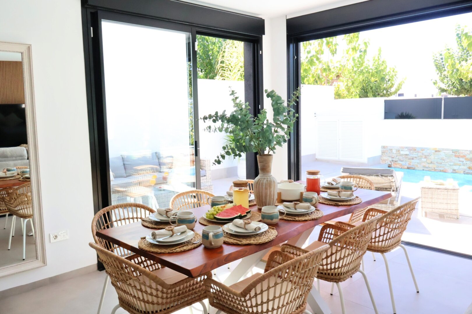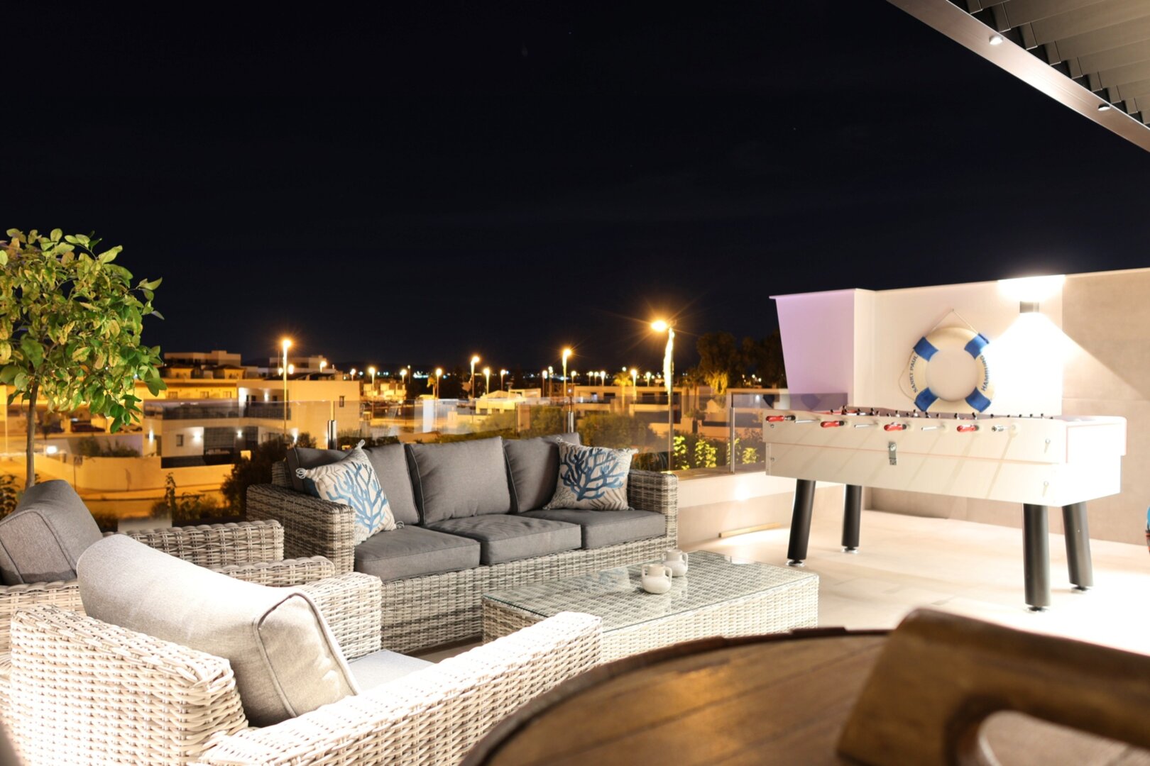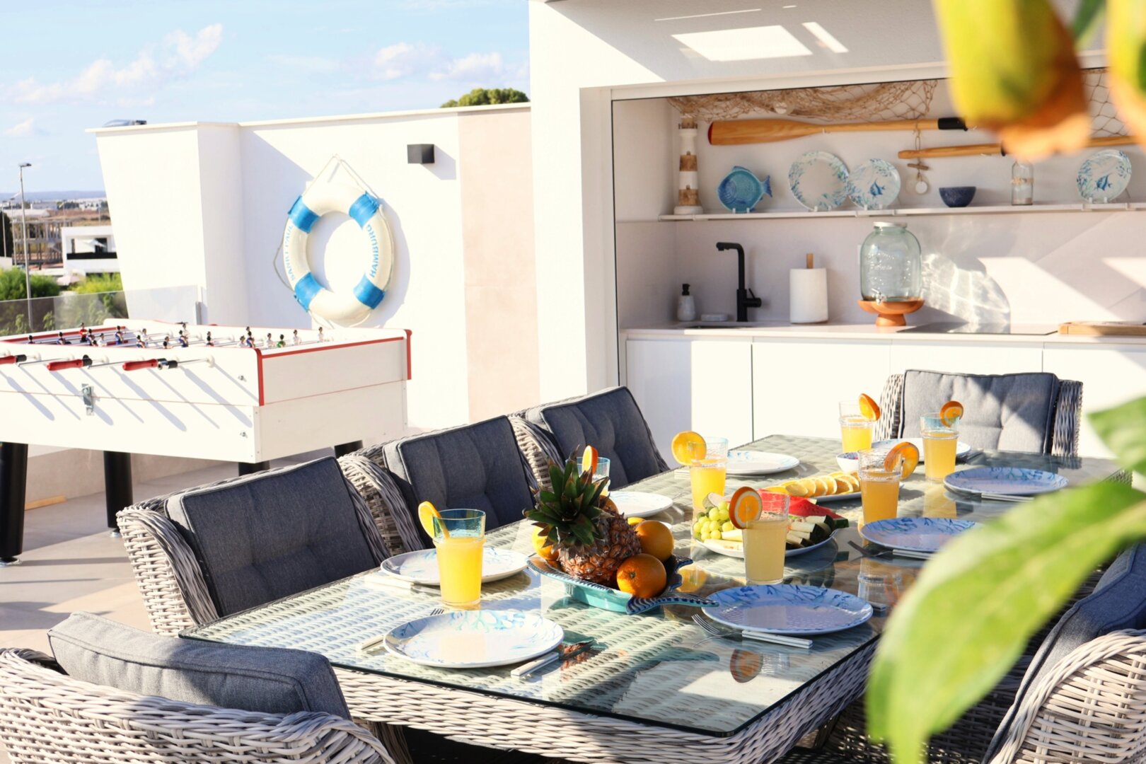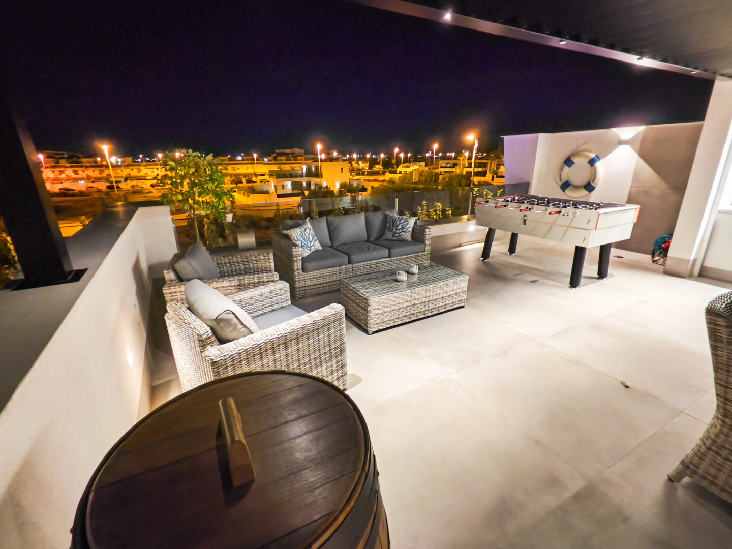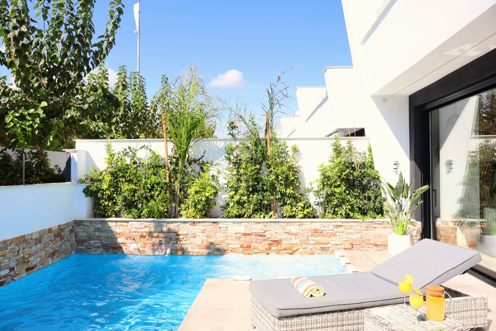 Villa description: Villa Murcia offers 220 m² of fully private space — the entire house, garden and terraces are reserved exclusively for you and your group. The interiors are bright, elegant and designed to provide full comfort for both short stays and longer holidays. Three bedrooms with private terrace access, air conditioning and TVs allow for independent relaxation, and the spacious living room with PlayStation is perfect for evenings together. The kitchen equipped with SMEG appliances makes home cooking easy and enjoyable, while the rooftop summer kitchen — with a grill, induction hob and fridge — creates the perfect setting for open-air dinners. The villa offers three bathrooms with underfloor heating and a full set of towels, including pool towels. A citrus garden allows you to pick your own lemon in the morning.