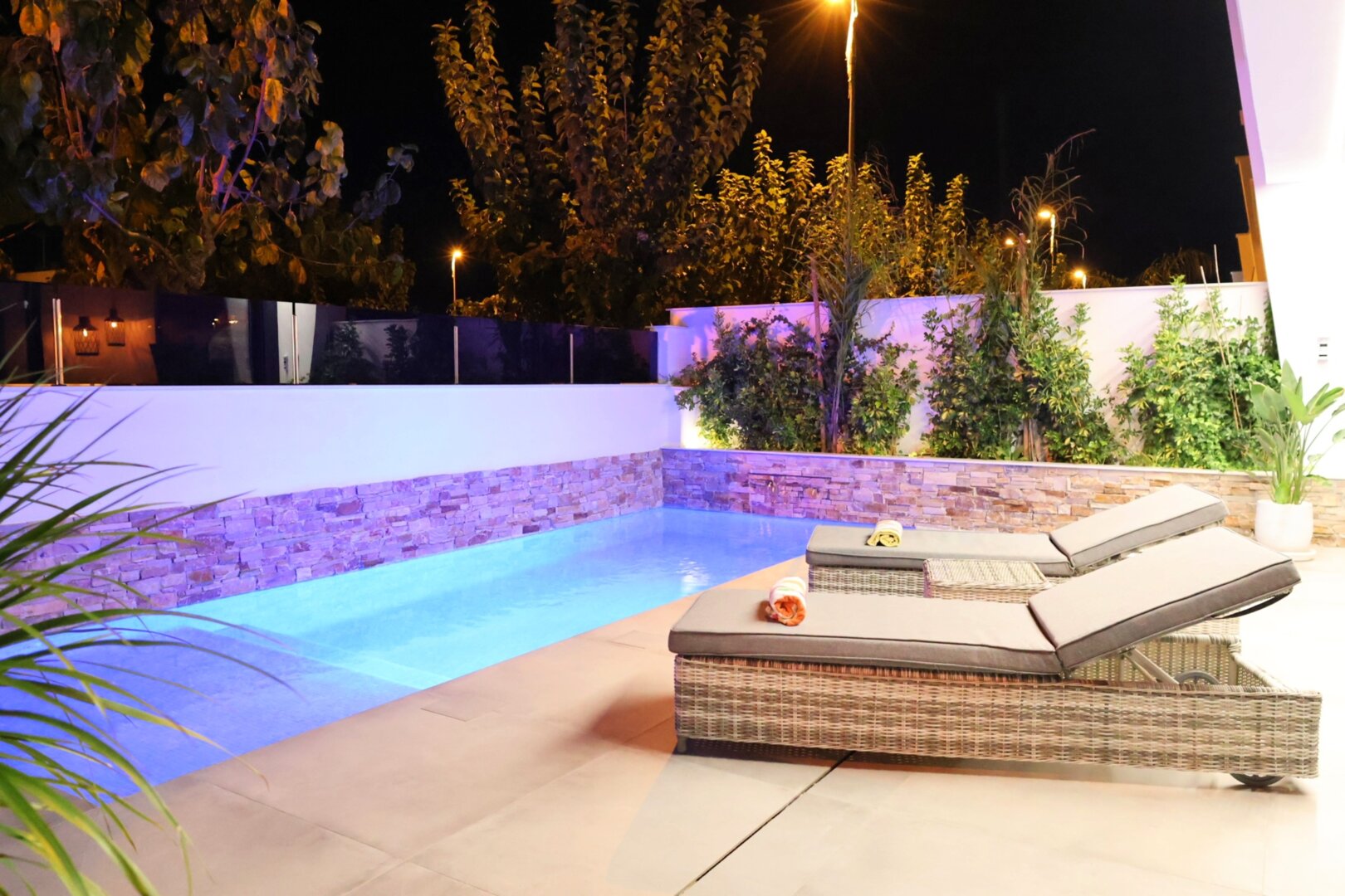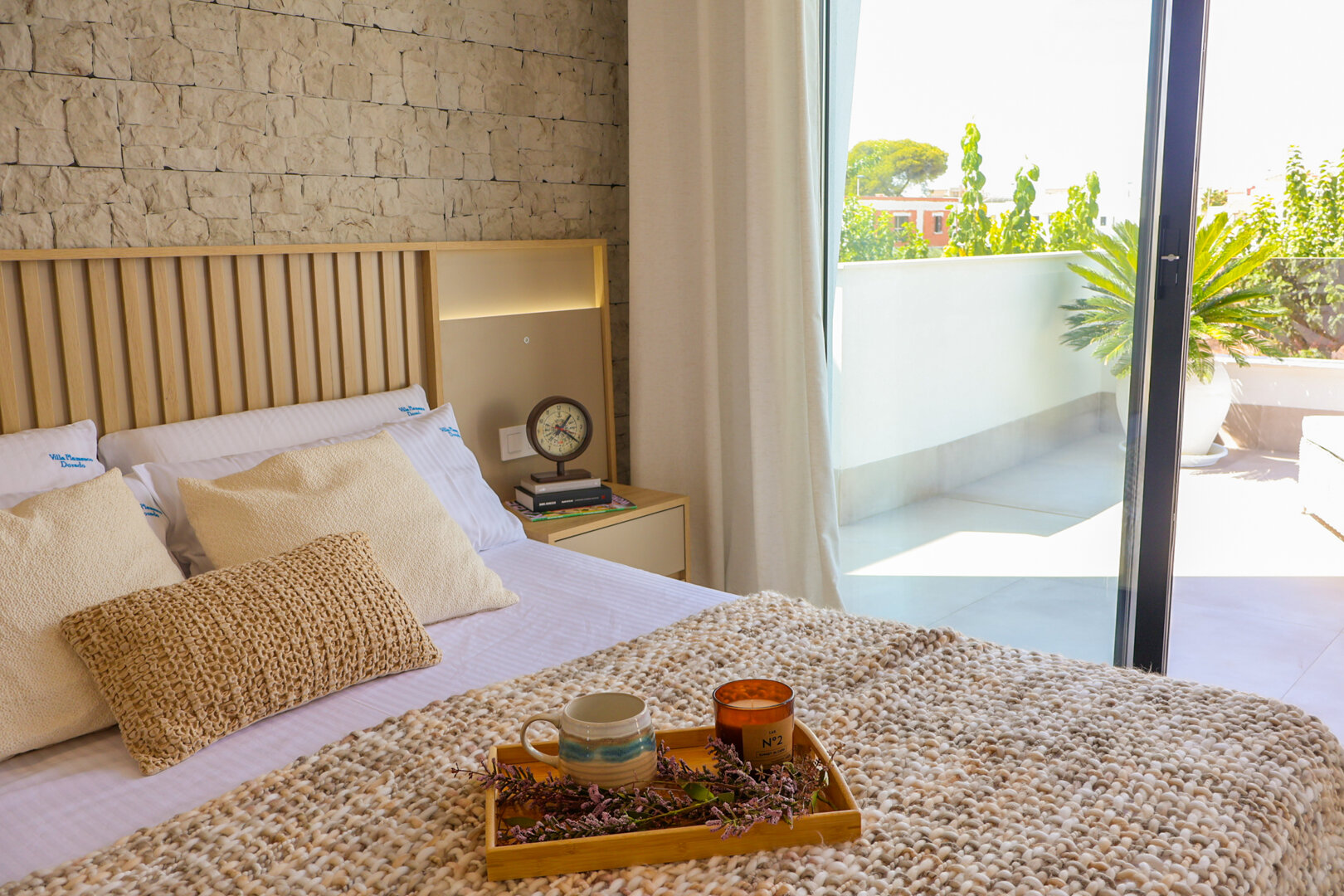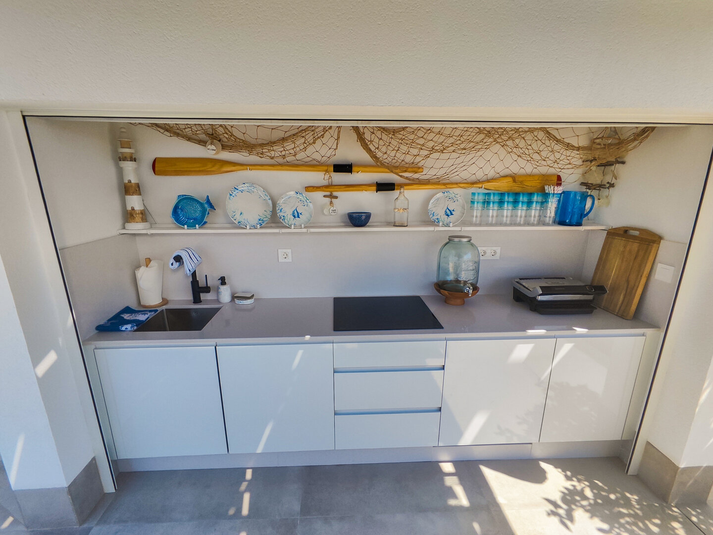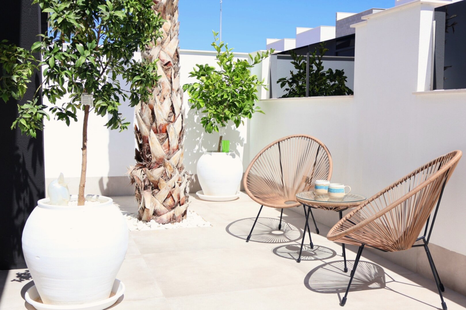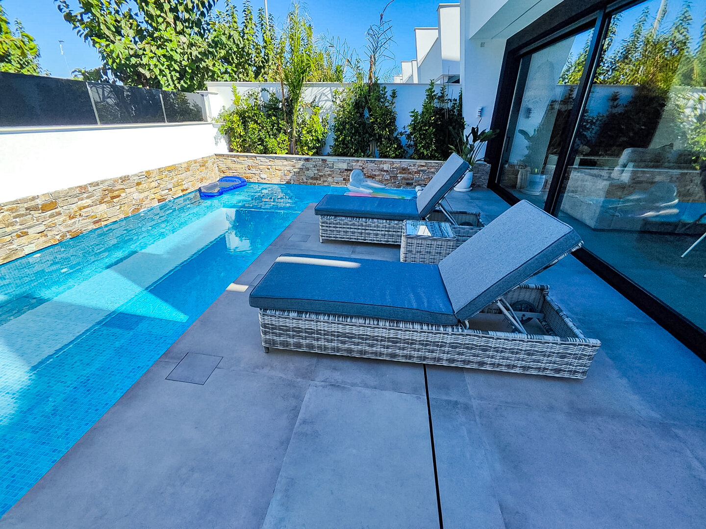 Villa description: Villa Murcia offers 220 m² of fully private space — the entire house, garden and terraces are reserved exclusively for you and your group. The interiors are bright, elegant and designed to provide full comfort for both short stays and longer holidays. Three bedrooms with private terrace access, air conditioning and TVs allow for independent relaxation, and the spacious living room with PlayStation is perfect for evenings together. The kitchen equipped with SMEG appliances makes home cooking easy and enjoyable, while the rooftop summer kitchen — with a grill, induction hob and fridge — creates the perfect setting for open-air dinners. The villa offers three bathrooms with underfloor heating and a full set of towels, including pool towels. A citrus garden allows you to pick your own lemon in the morning.