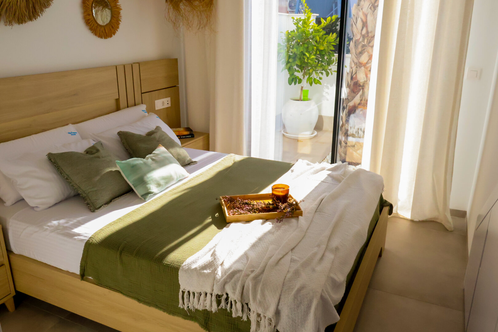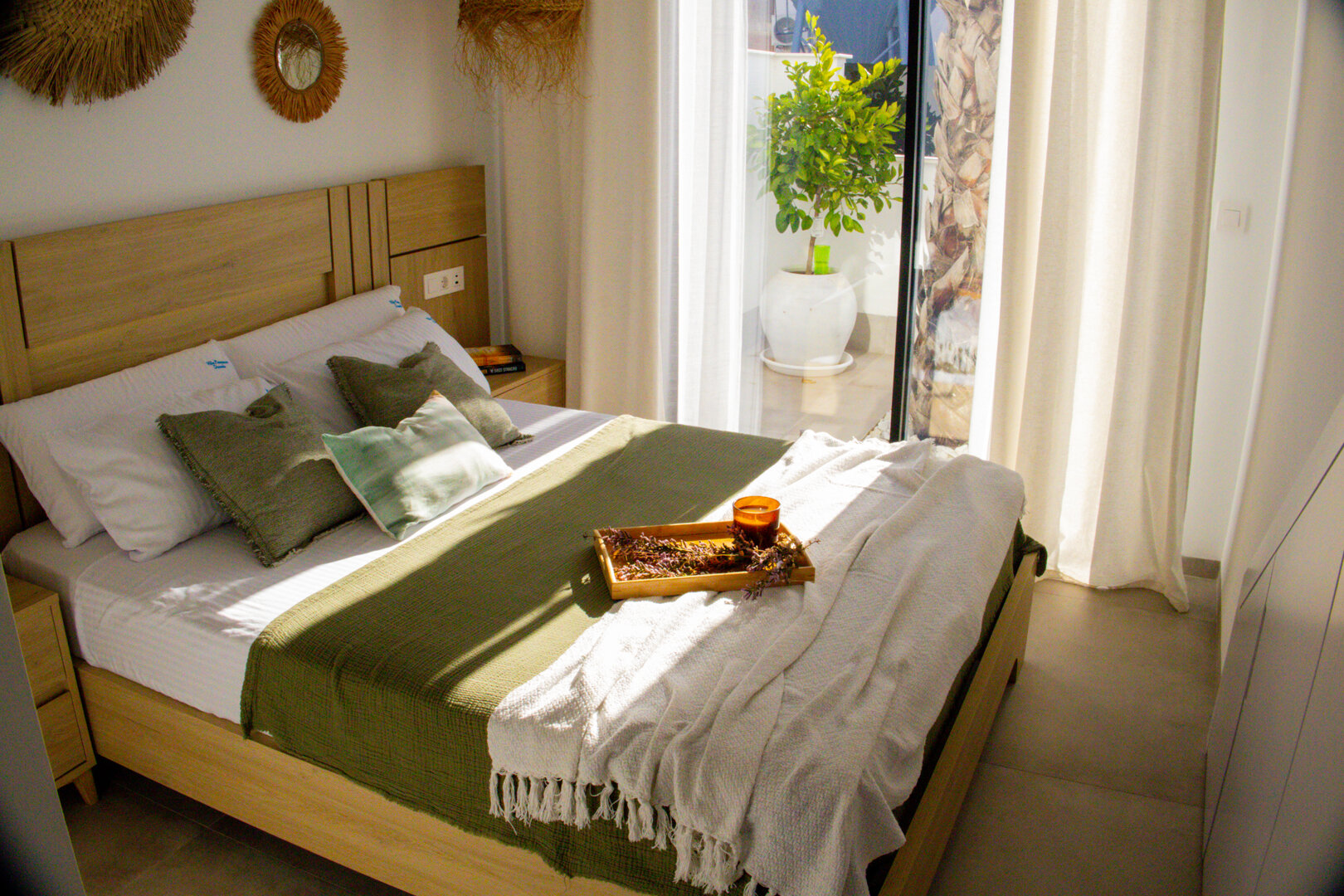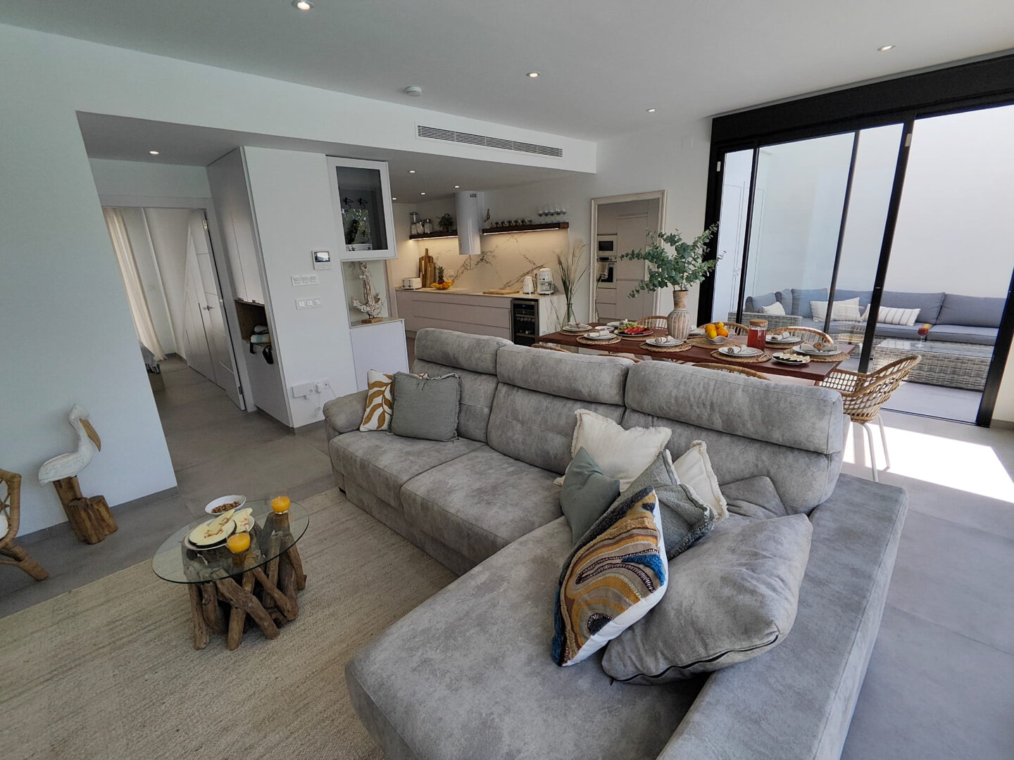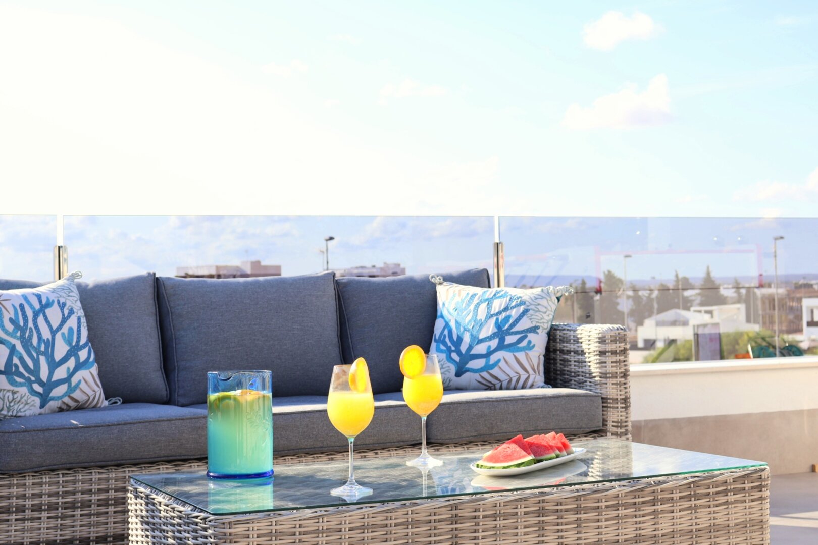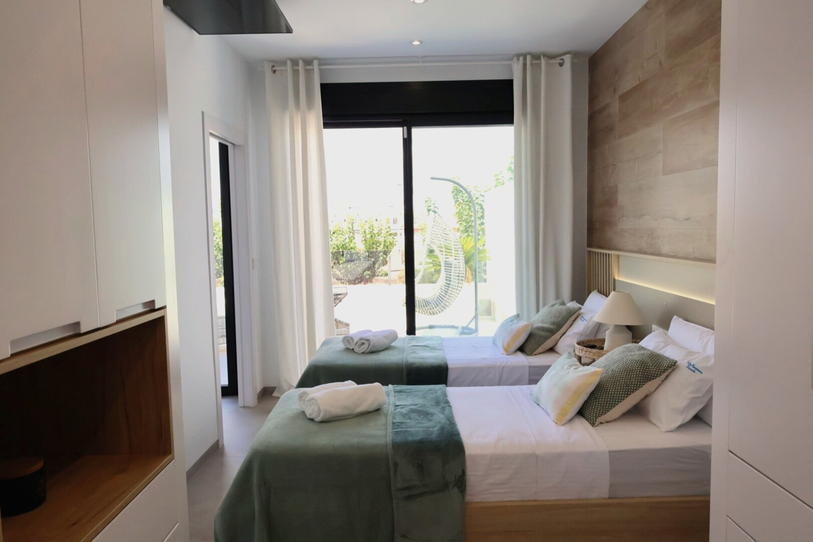 Villa description: Villa Murcia offers 220 m² of fully private space — the entire house, garden and terraces are reserved exclusively for you and your group. The interiors are bright, elegant and designed to provide full comfort for both short stays and longer holidays. Three bedrooms with private terrace access, air conditioning and TVs allow for independent relaxation, and the spacious living room with PlayStation is perfect for evenings together. The kitchen equipped with SMEG appliances makes home cooking easy and enjoyable, while the rooftop summer kitchen — with a grill, induction hob and fridge — creates the perfect setting for open-air dinners. The villa offers three bathrooms with underfloor heating and a full set of towels, including pool towels. A citrus garden allows you to pick your own lemon in the morning.