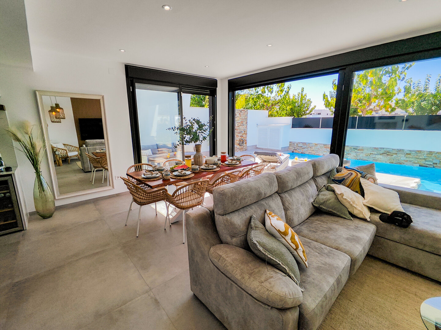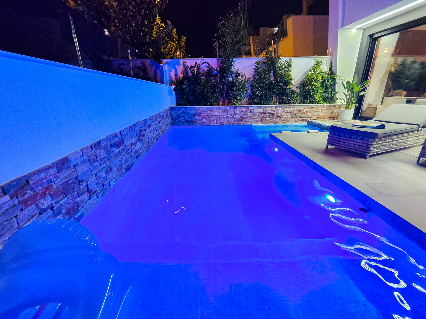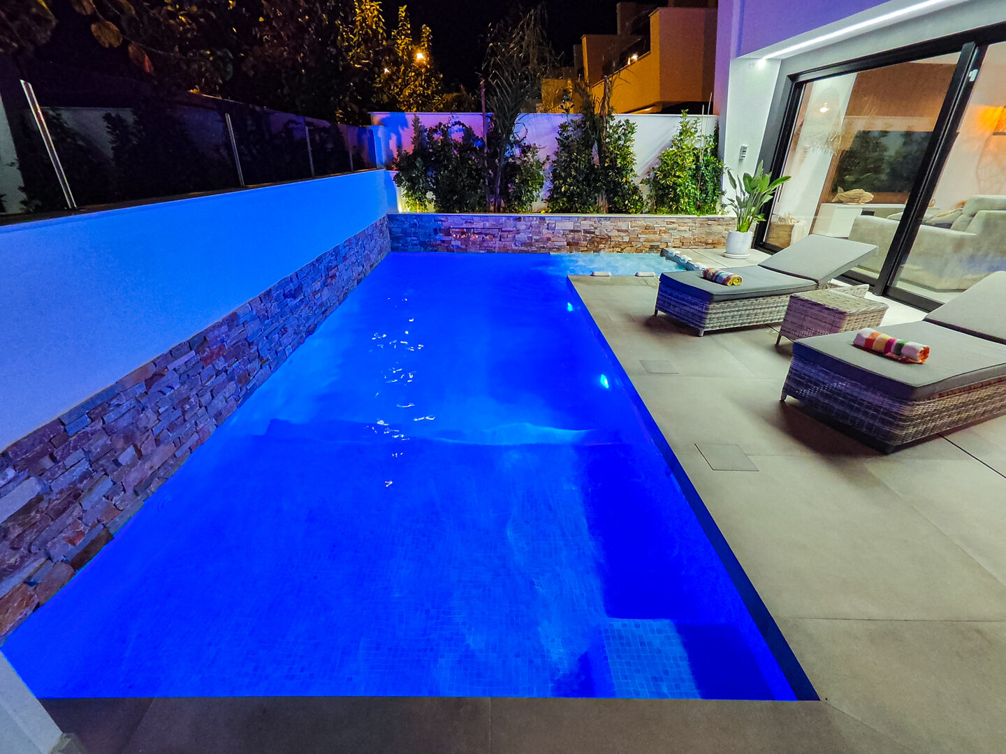 Villa Murcia is an elegant holiday home created for guests who expect space, comfort and privacy. Located in a quiet part of Santiago de la Ribera, it offers relaxation surrounded by palm trees and the warm climate of the Menor Sea. A heated pool, jacuzzi, rooftop terrace and relaxation area make every day easy to experience differently — active, lazy, sunny or with a glass of wine in the evening.