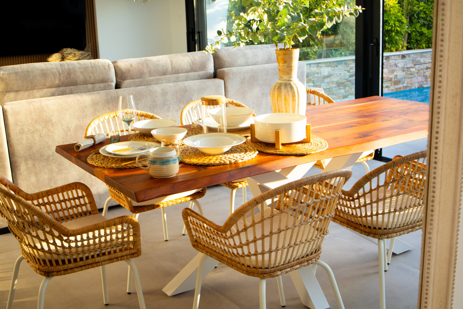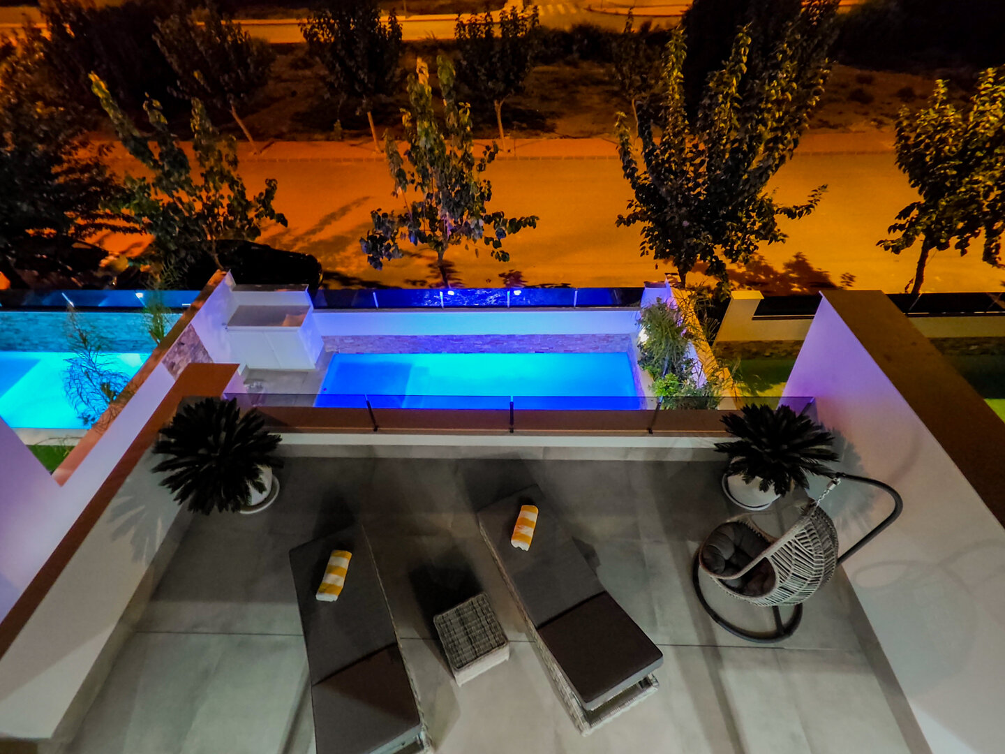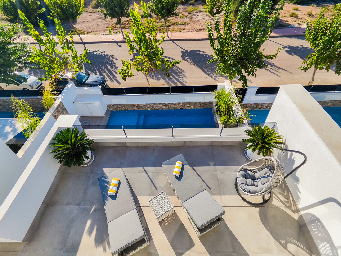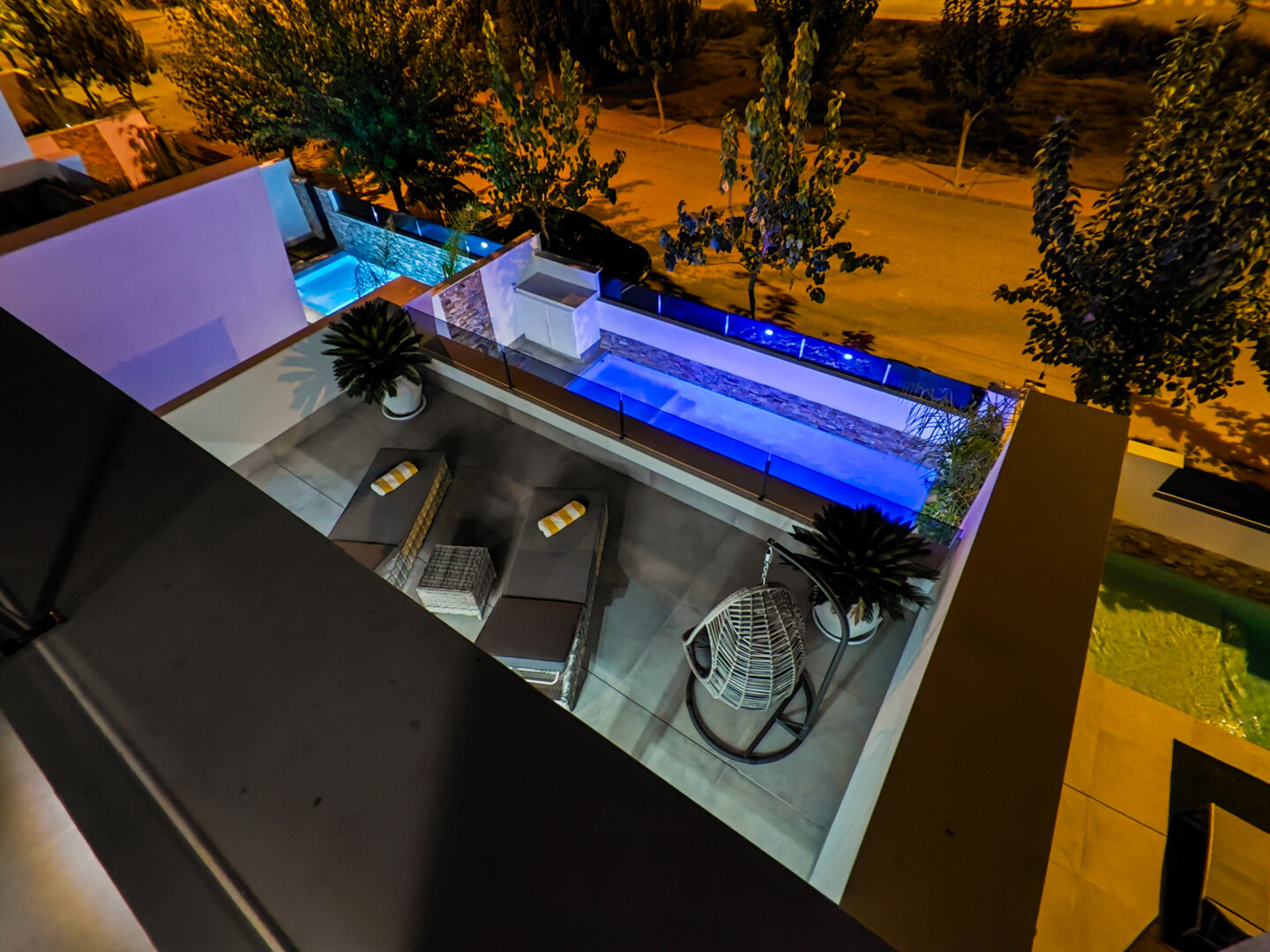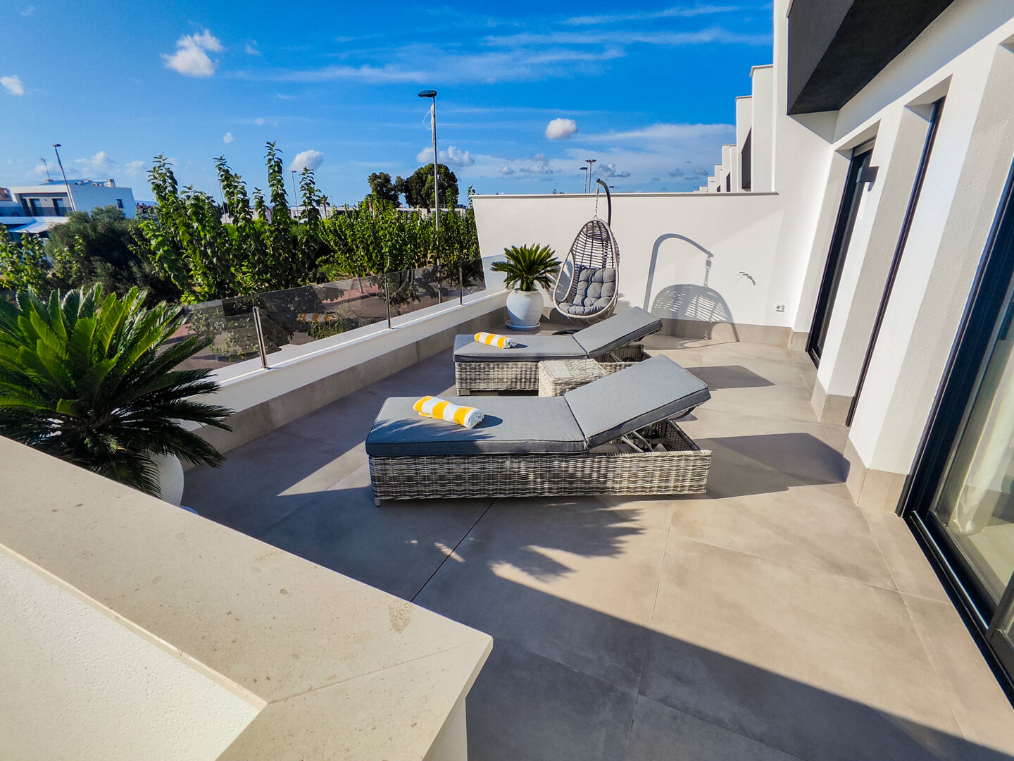 - hanging chair, comfortable loungers, large outdoor dining table