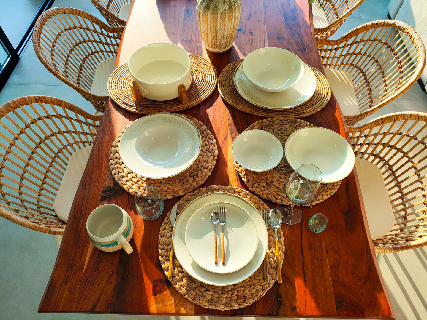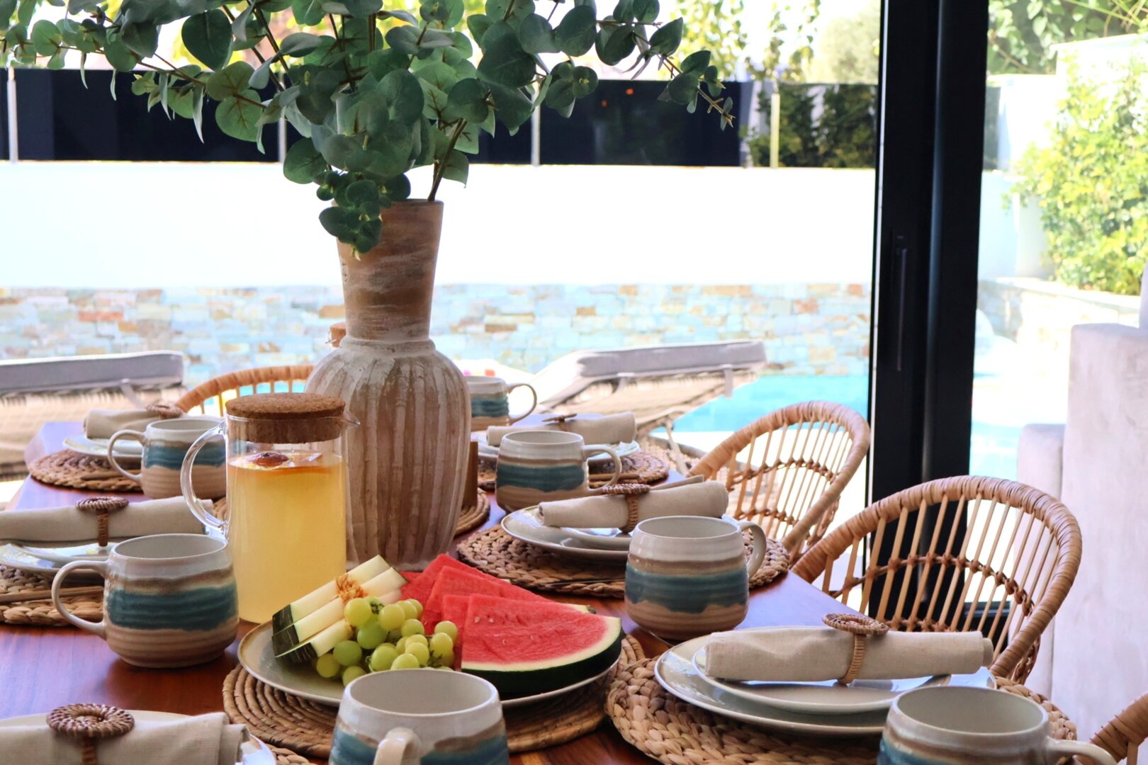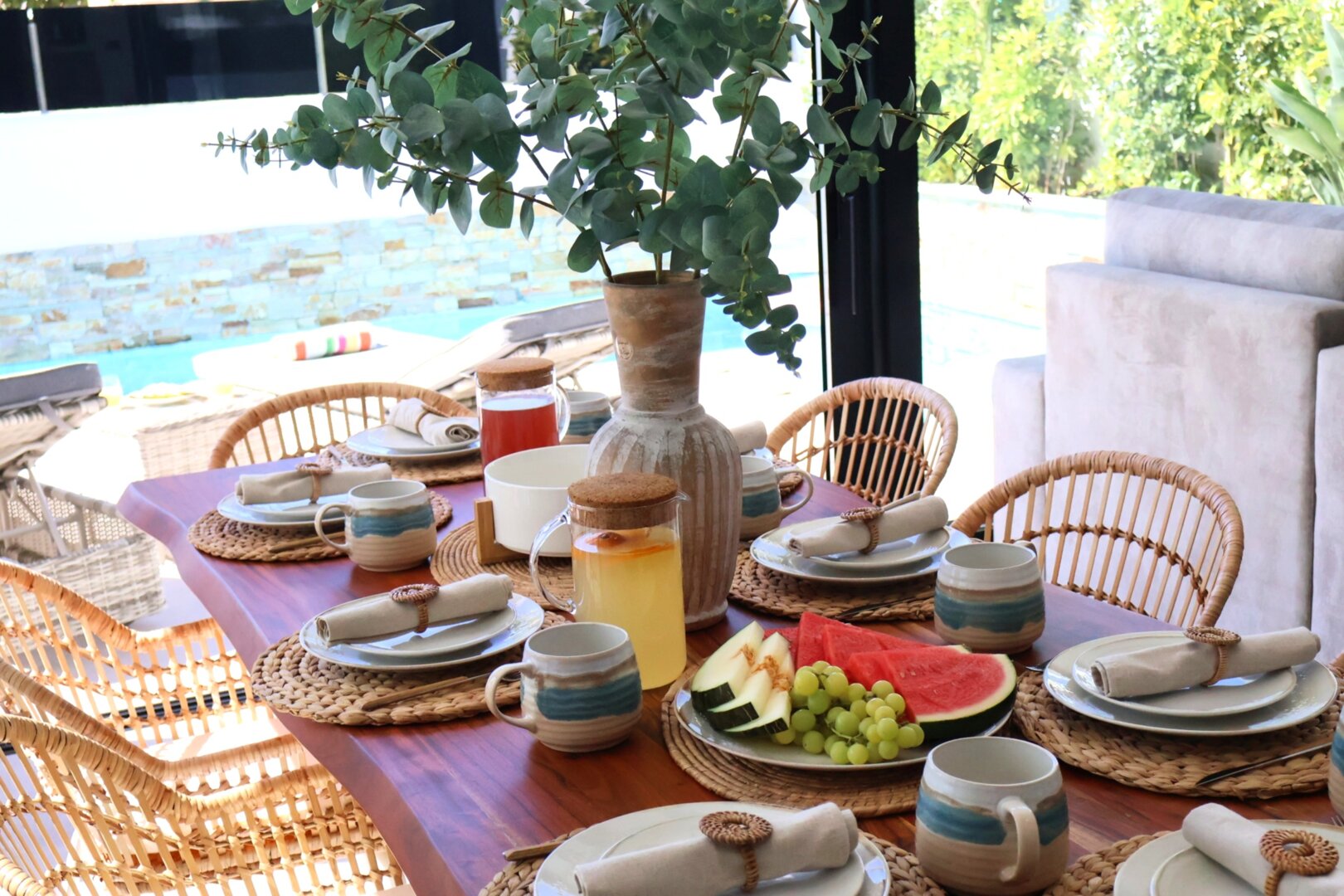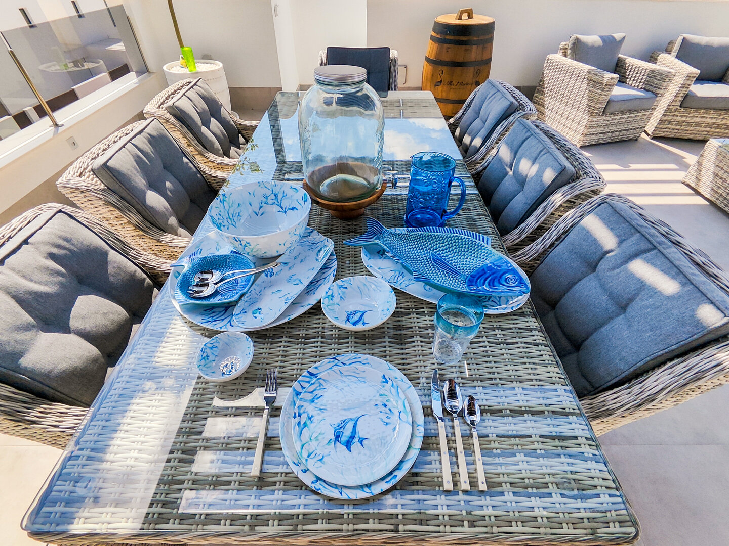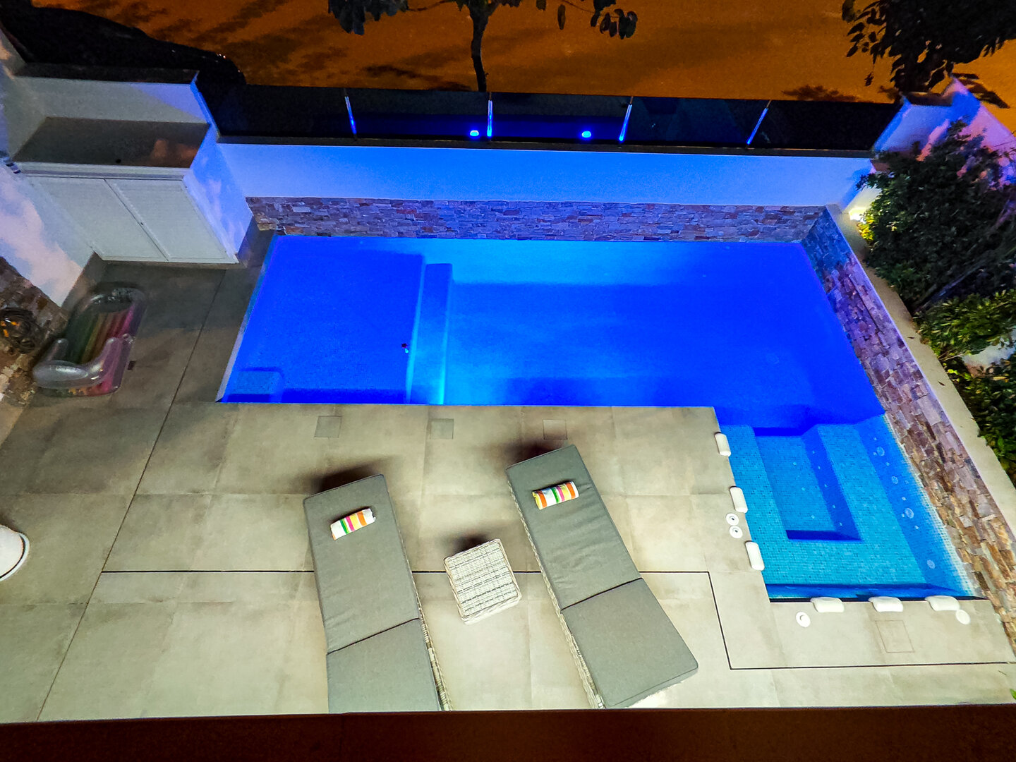 - hanging chair, comfortable loungers, large outdoor dining table