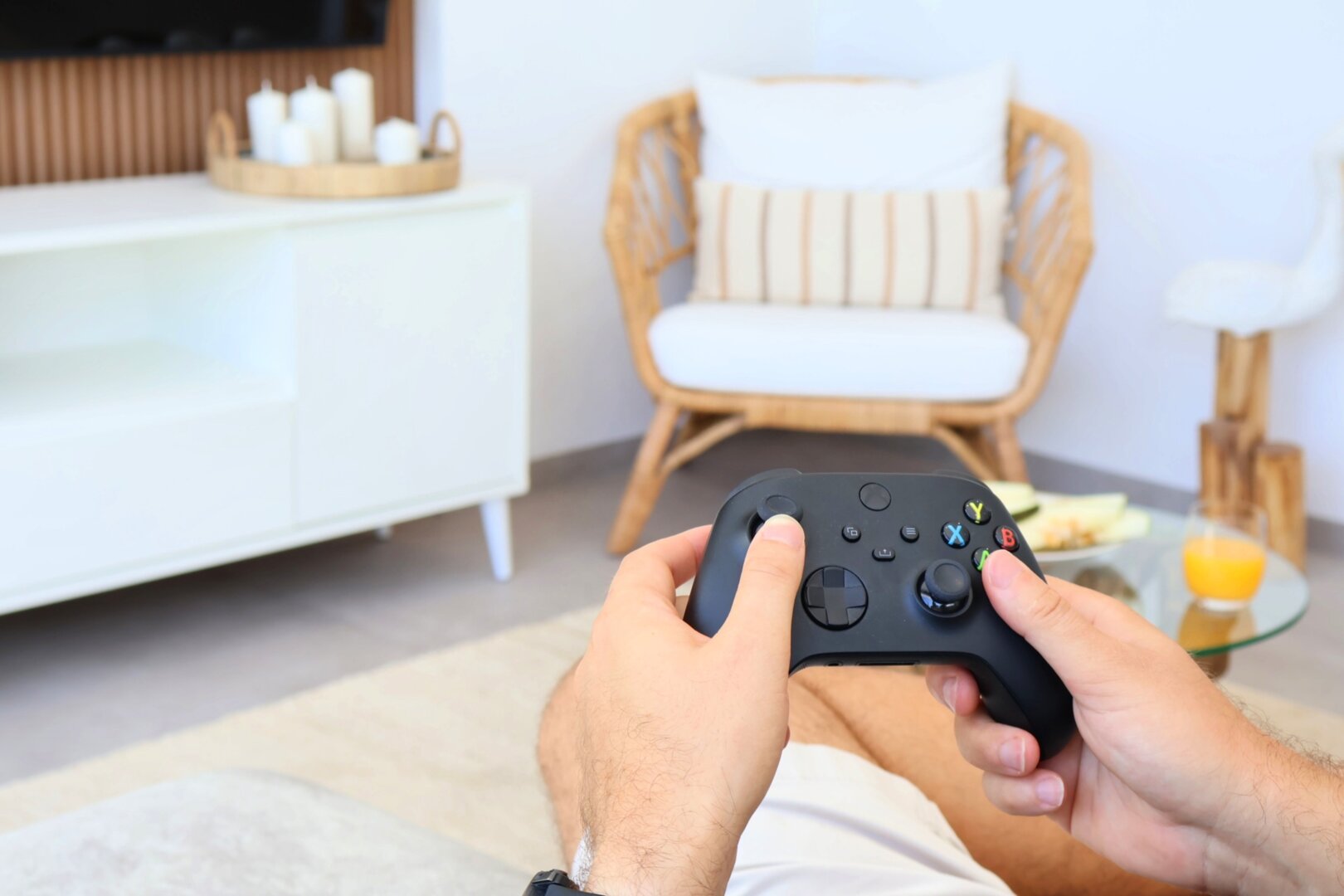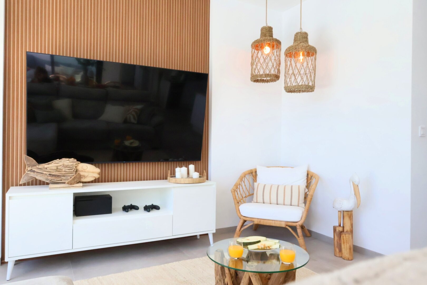 - spacious living room with sofa, TV and PlayStation