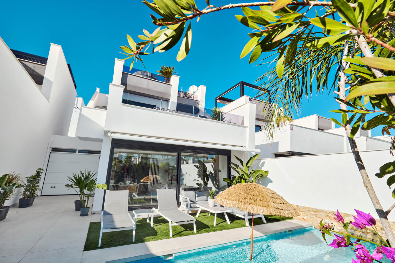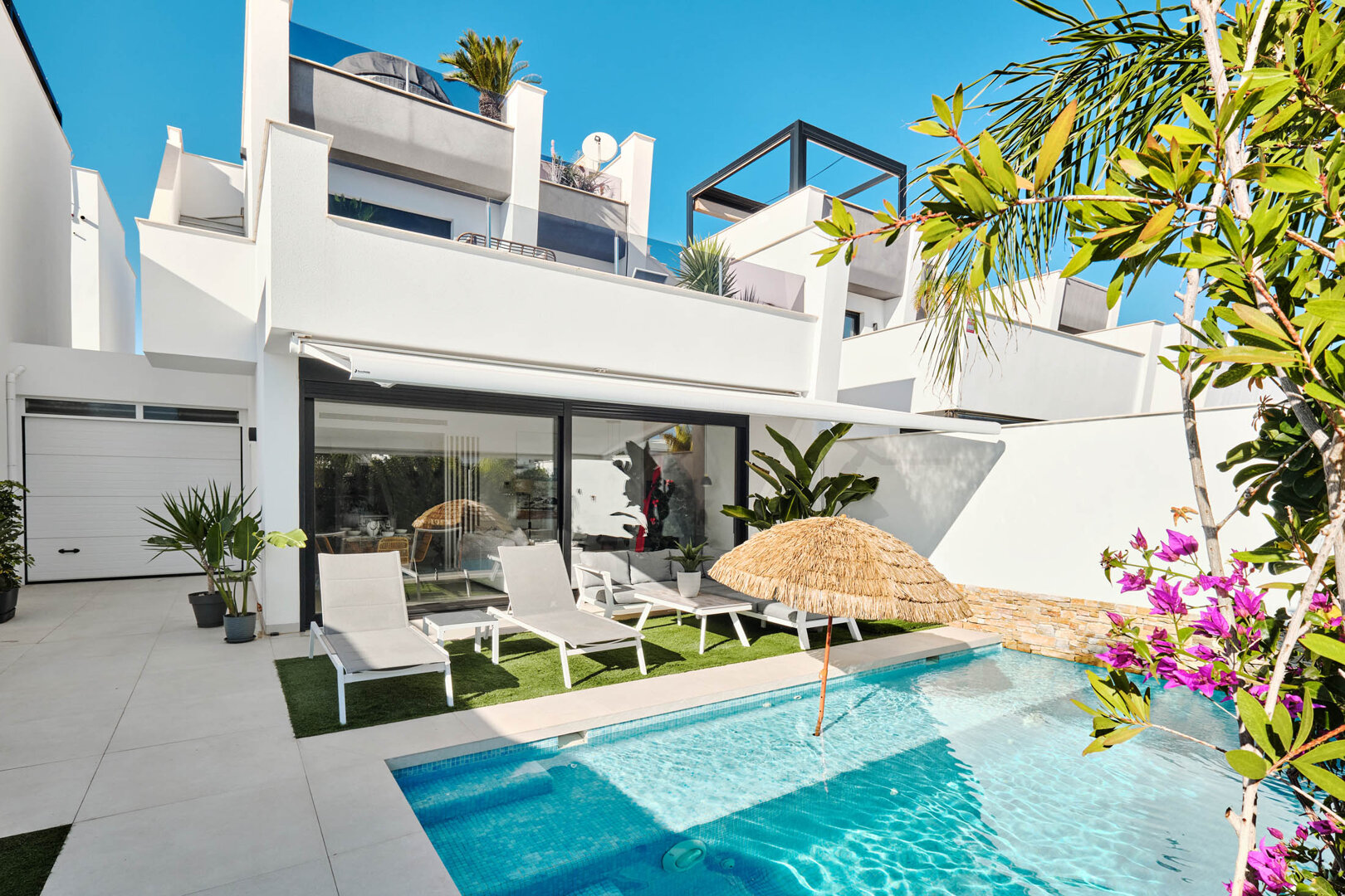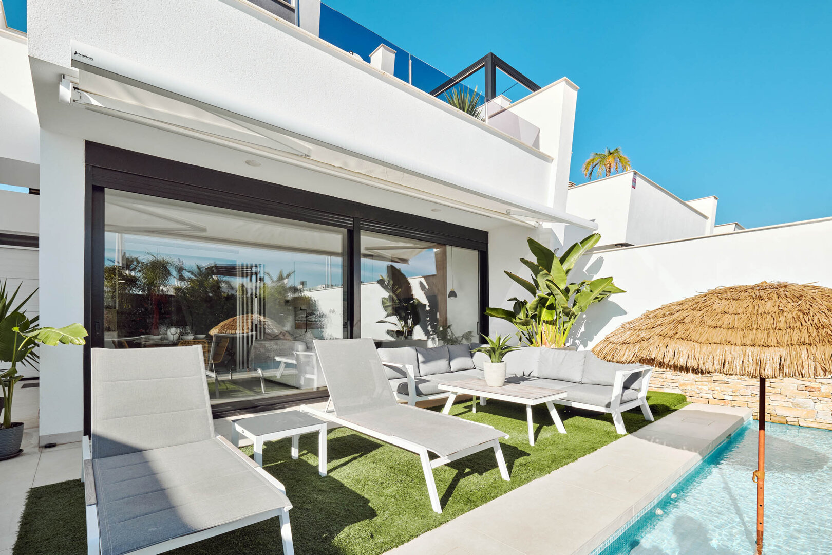 Description of the house: Villa Bahia offers a comfortable space designed for relaxation at any time of the year. The interiors are bright, modern and carefully furnished — in a light Mediterranean style with natural accents. Three bedrooms with double beds and two bathrooms provide comfort for larger groups, while the spacious living room with access to the terrace is perfect for unwinding together. The fully equipped kitchen allows guests to prepare meals comfortably, while the private garden and barbecue area make it easy to enjoy the warm climate of San Pedro del Pinatar. The biggest highlight of the house is the private heated pool, allowing for year-round swimming.